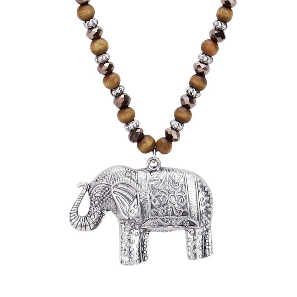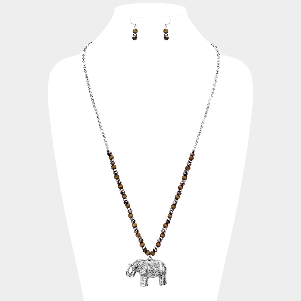 Burnished Metal Elephant Pendant Beaded Long Necklace