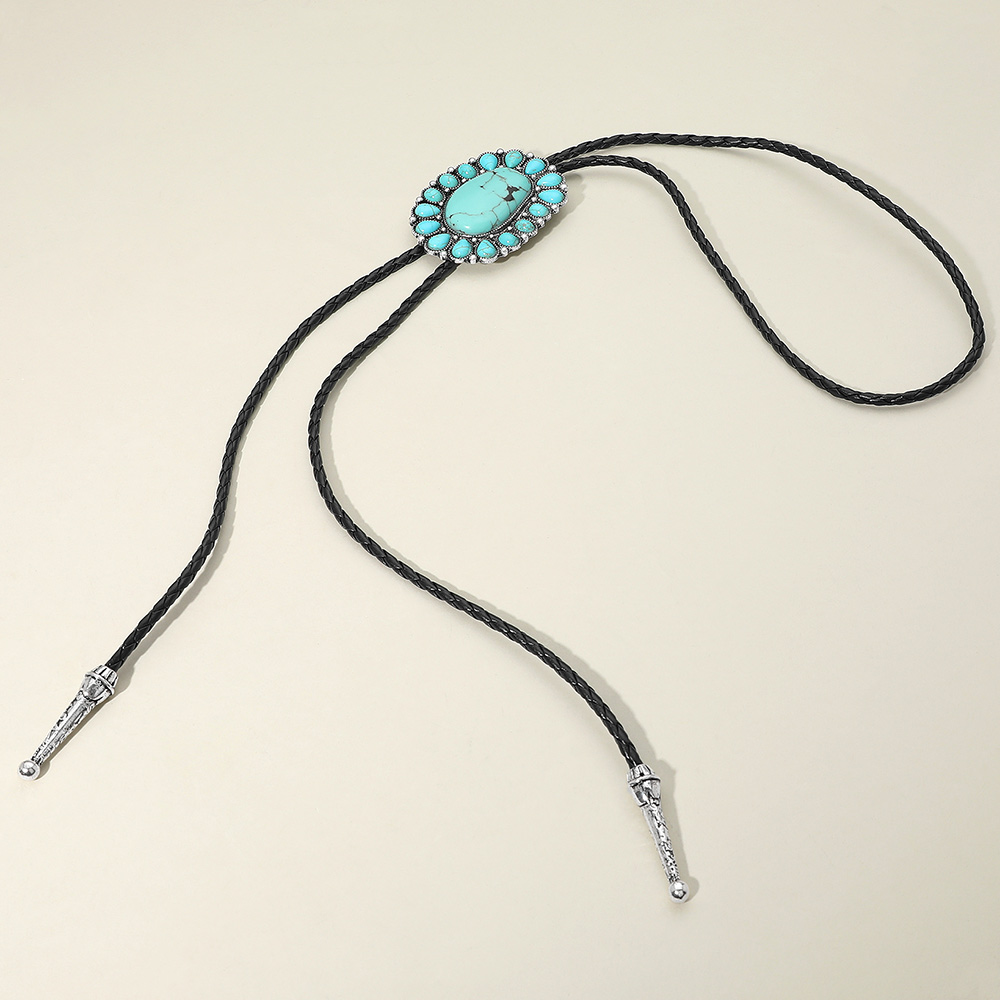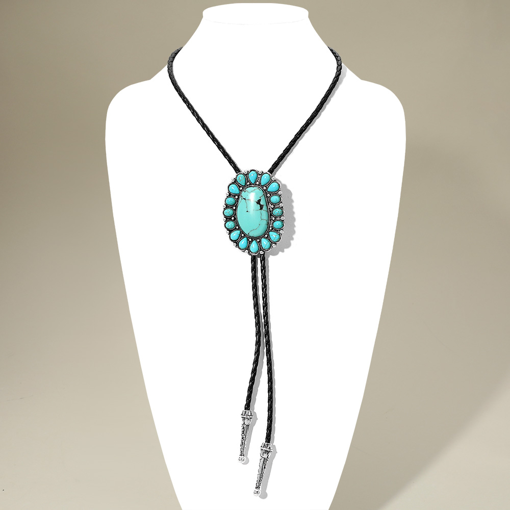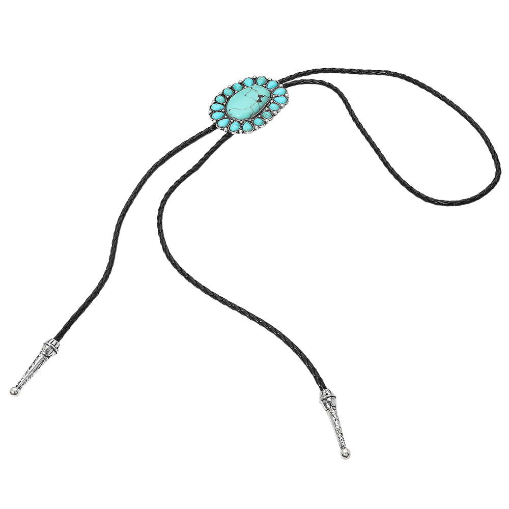 Details • Necklace Size : 46" L / Adjustable • Pendant Size : 2" X 2.6" • Striking Western-style lariat necklace featuring an oval turquoise pendant framed by teardrop stones and detailed silver accents. Hung on a braided cord with classic bolo tips, it’s the perfect blend of rustic charm and bold elegance. • Lead and Nickel Compliant