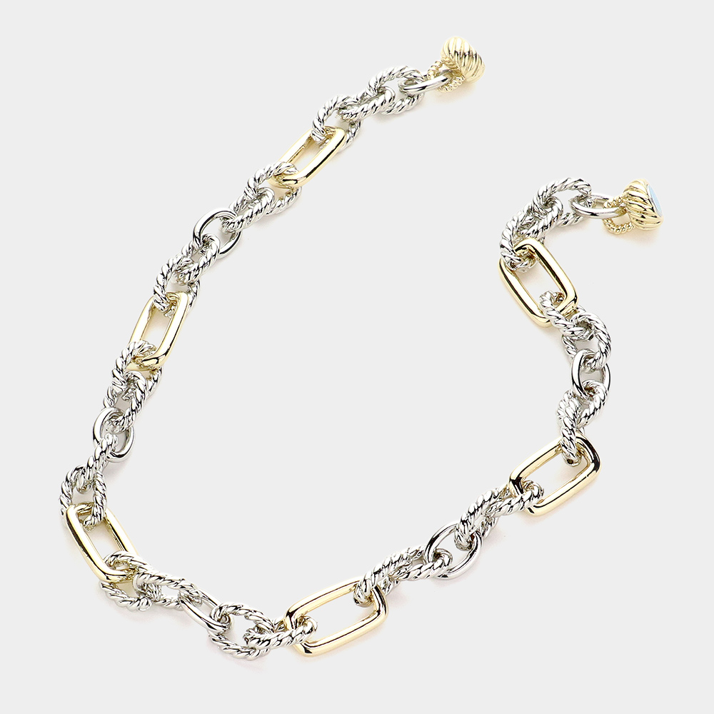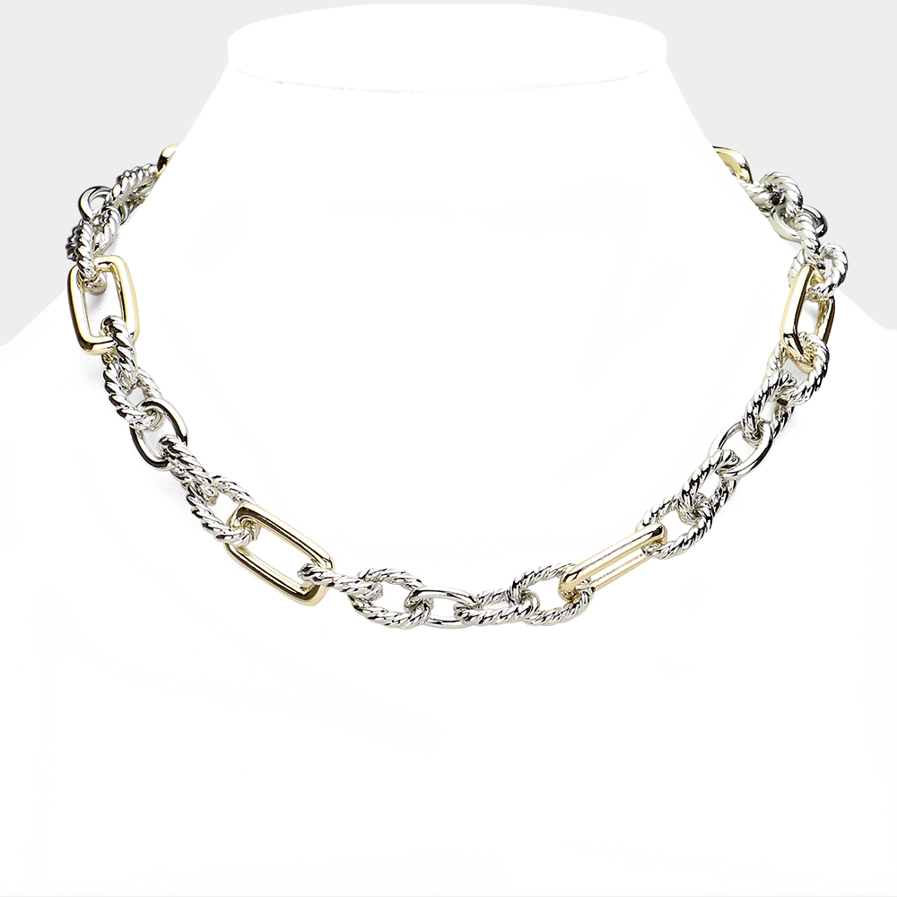 Details • Necklace Size : 17" L • Decor Size : 0.5" L • Magnetic Closure • A bold take on classic chains, this textured mixed link necklace blends polished and rugged details for a striking modern look. Secured with a magnetic clasp for easy wear, it’s the ultimate versatile piece to elevate casual outfits or complement evening styles. • Gold Dipped