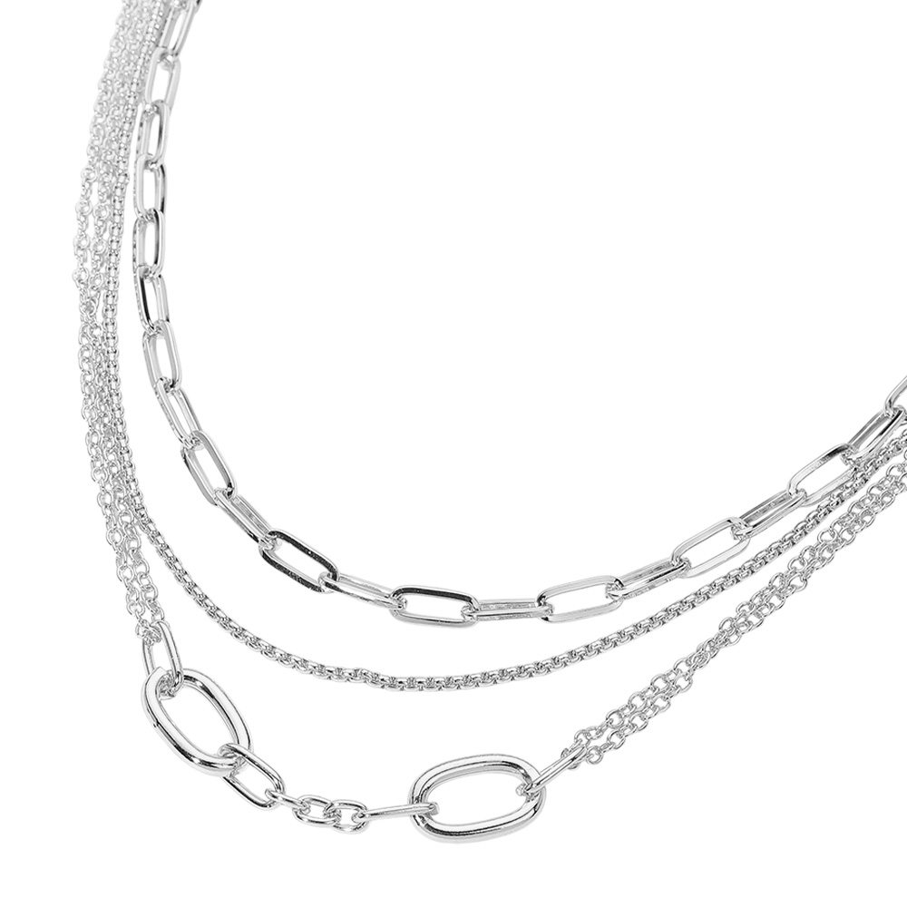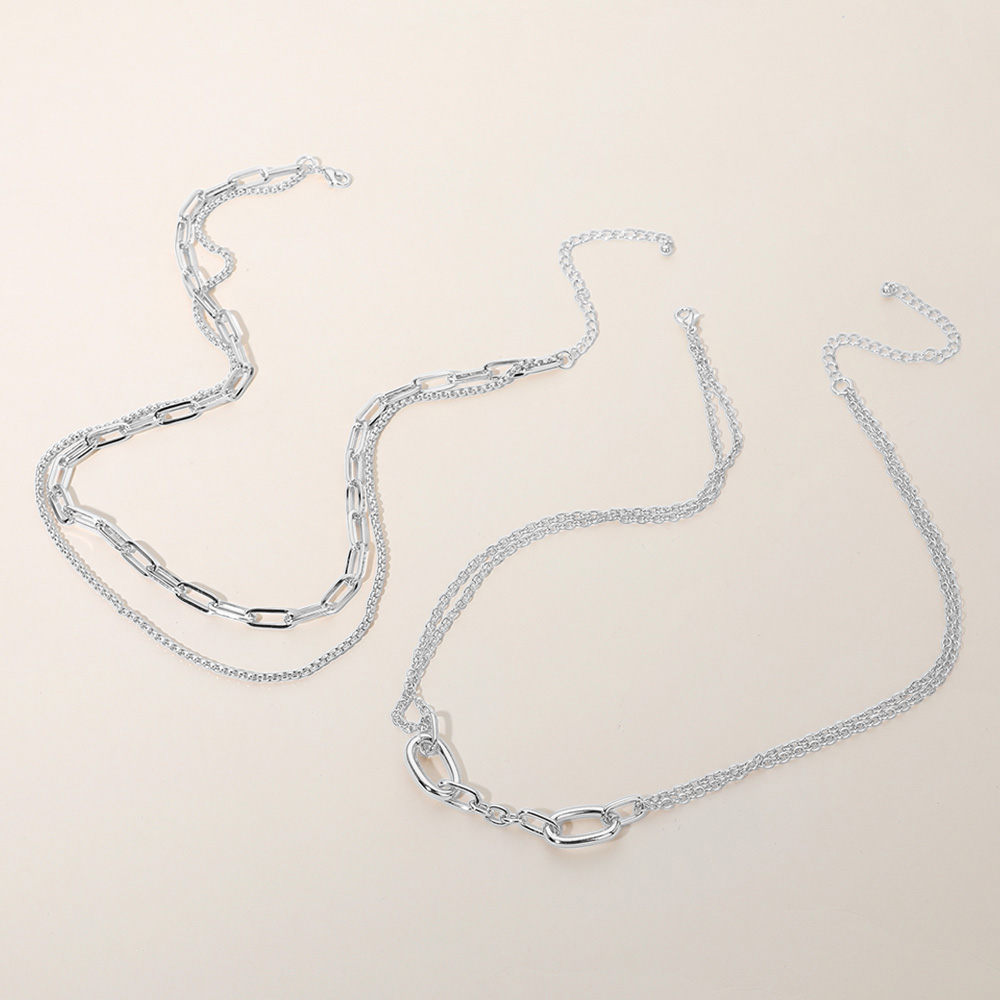 Details • Necklace 1 Size : 15.5" + 3.25" L, 0.75" L • Necklace 2 Size : 17" + 3.25" L, 0.4" L • Stylish layered chain necklace featuring mixed link designs for a bold yet elegant look. The multi-strand style adds texture and dimension, making it perfect for enhancing any casual or formal outfit with a touch of modern sophistication and effortless charm. • Lead and Nickel Compliant