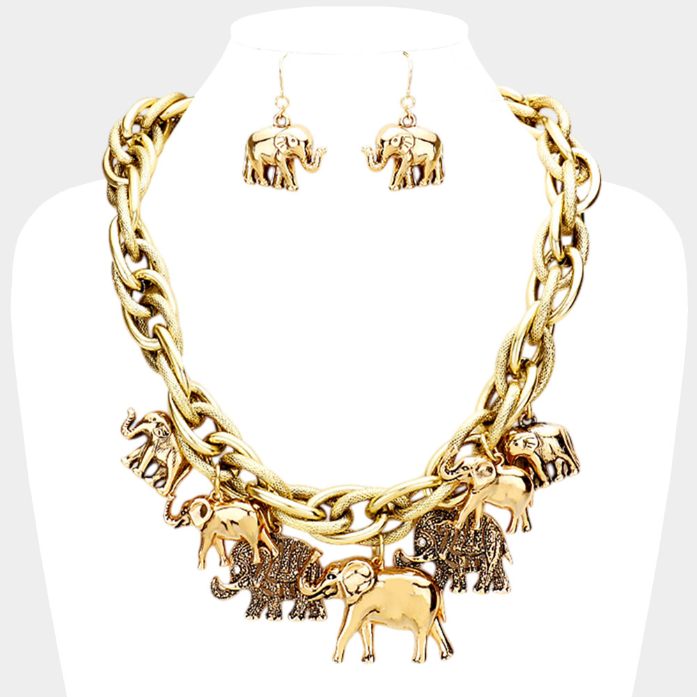 Details • Necklace Size : 18" + 3" L • Decor Size : 2" L • Earring Size: 1.5" L • Bold statement necklace featuring layered chain styling accented with detailed elephant charms and a coordinated drop earring pair. Designed to create visual impact, this playful yet elegant set adds character and charm to everyday outfits, themed looks, and special occasions with an eye-catching silhouette. • Lead and Nickel Compliant