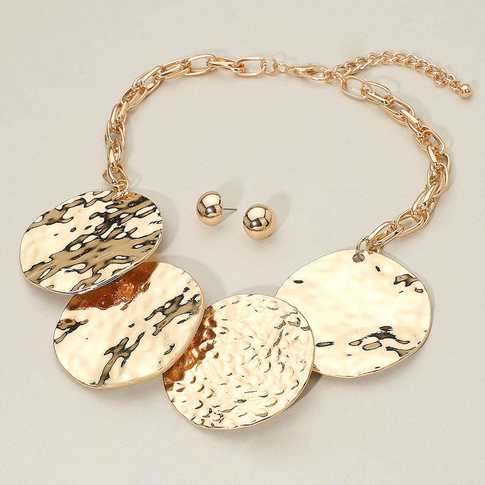 Details • Necklace Size : 18" + 3" L • Decor Size : 2.3" L • Earrings Size : 0.5" L • Stand out with this hammered disc necklace and matching stud earring set designed to deliver bold texture and modern shine. Featuring layered circular pendants and an adjustable chain, it’s ideal for elevating everyday outfits or enhancing evening looks with confident, contemporary style and coordinated elegance. • Lead and Nickel Compliant