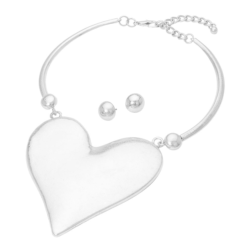 Details • Necklace Size : 14.5" + 3" L • Decor Size : 3.75" X 3.75" • Earrings Size : 0.6" L • Make a bold romantic statement with this oversized heart pendant necklace paired with simple stud earrings. Ideal for standout fashion moments, special occasions, or unique everyday style, this set adds a striking artistic touch that highlights your look with confident, eye-catching charm. • Lead and Nickel Compliant