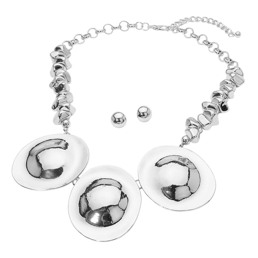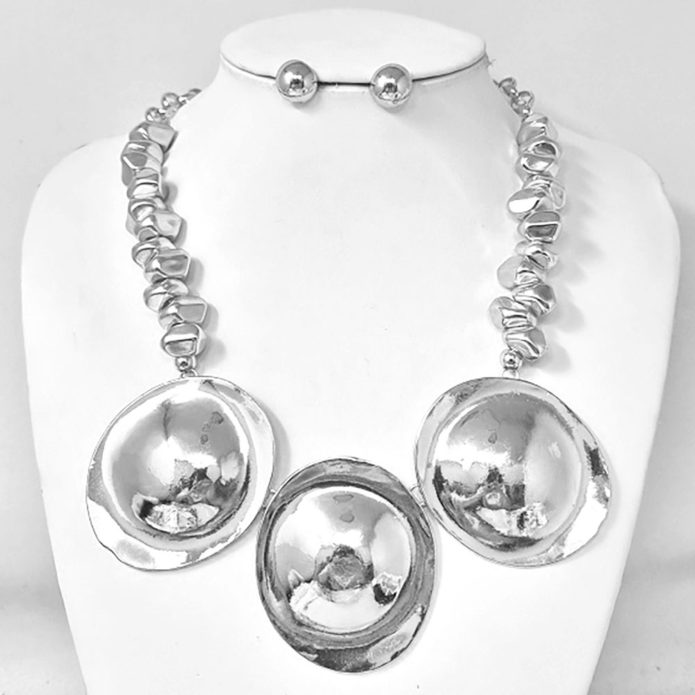 • Elevate your look with this striking necklace featuring sculpted disc accents paired with classic stud earrings. Designed for bold, artistic style, this set adds a dramatic touch to evening outfits, special events, or statement fashion moments, offering standout elegance with a modern, eye-catching finish.