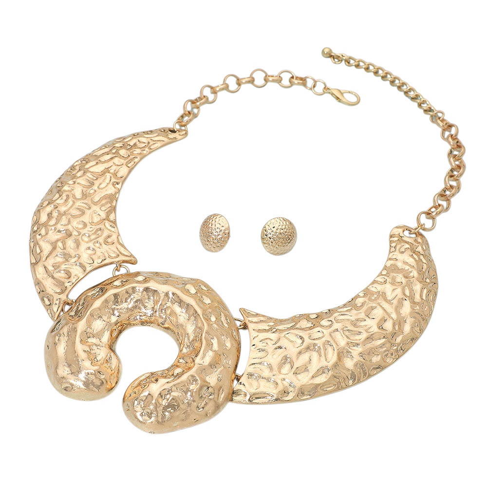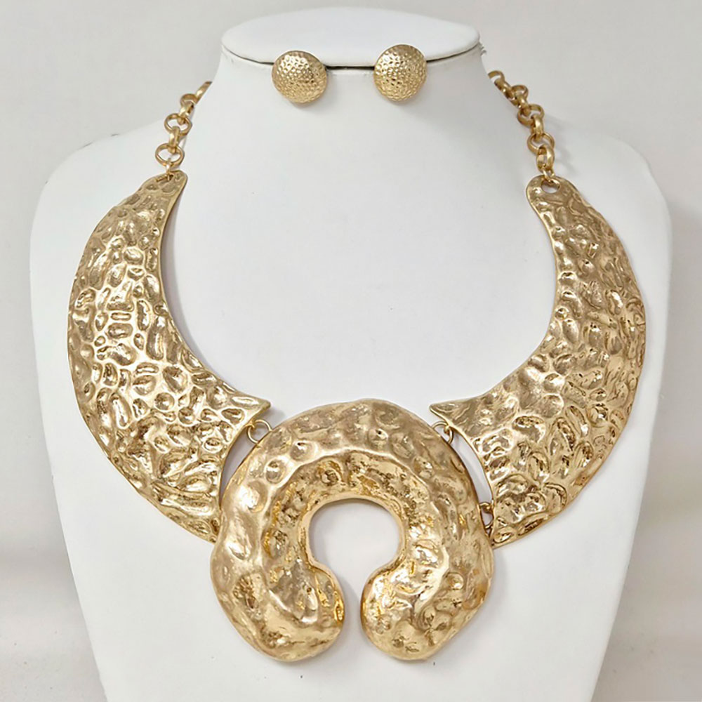 • Command attention with this bold textured collar necklace and matching earrings. Featuring a sculpted crescent design with artistic detailing, this statement set adds modern sophistication and a touch of drama, perfect for evening wear or standout fashion moments.