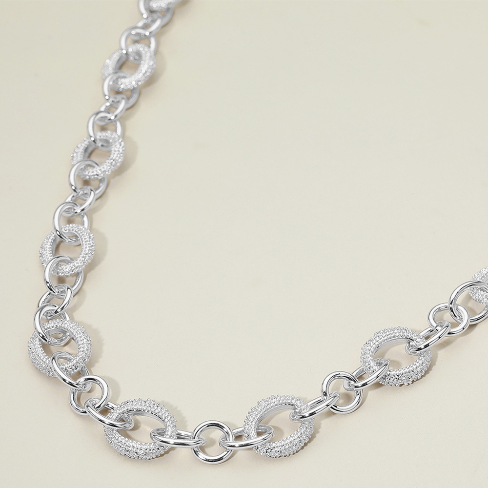 Details • Necklace Size : 16.5" + 3.5" L • Decor Size : 0.6" L • Elevate your look with this textured link chain necklace featuring alternating smooth and detailed circular links. A bold yet versatile statement piece, perfect for layering or wearing solo. Designed for modern style and timeless appeal, this chain necklace adds sophistication to any outfit. • Lead and Nickel Compliant