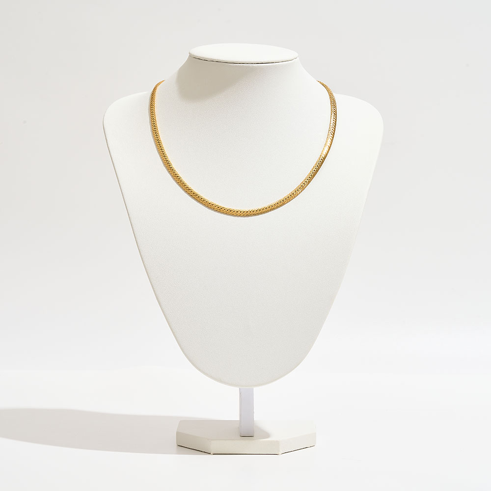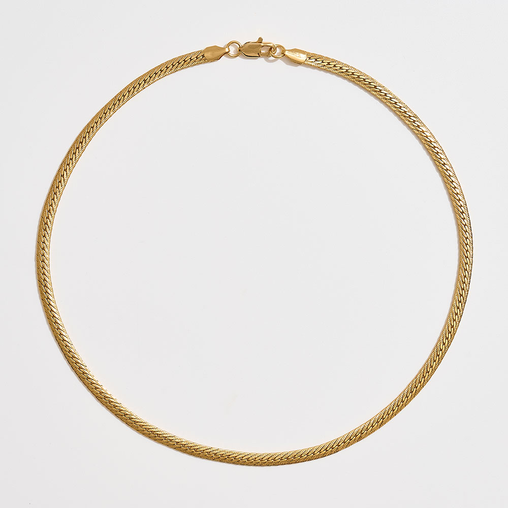 Details • Necklace Size : 18" + 1" L • Decor Size : 0.2" L • Make a bold yet elegant statement with this classic herringbone chain necklace. Its fluid, reflective design lays flat for a polished look, making it perfect to wear alone or layer with other favorites. A timeless staple that adds sophistication to both casual and formal outfits. • Brass • Gold Dipped • Hypoallergenic • Made In Korea