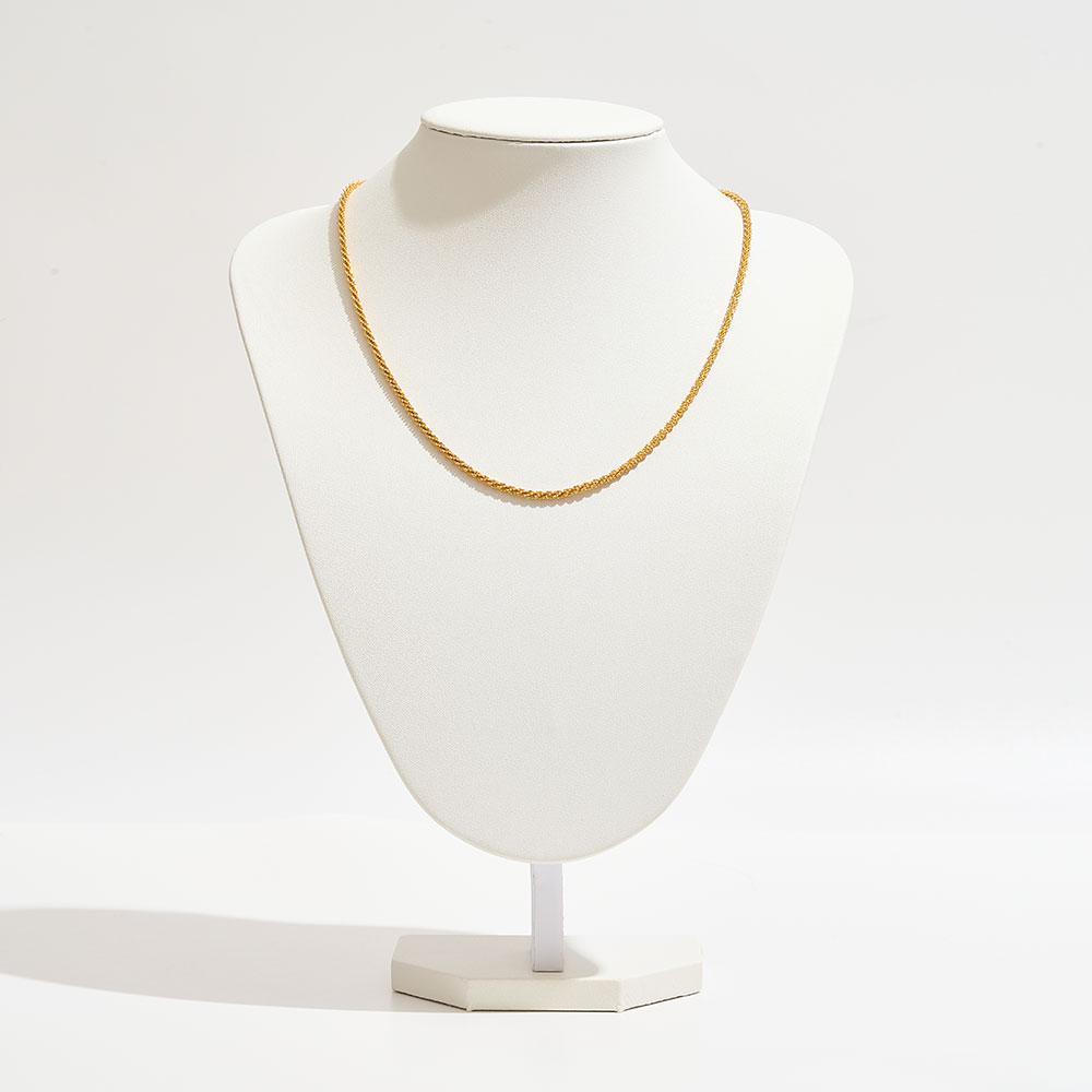 Details • Necklace Size : 18" + 1" L • Decor Size : 0.2" L • Elevate your style with this slim rope chain necklace, crafted with delicate twists that add refined texture and shine. Lightweight and versatile, it’s the perfect piece for layering or wearing alone, offering timeless sophistication for both casual and formal looks. • Brass • Gold Dipped • Hypoallergenic • Made In Korea
