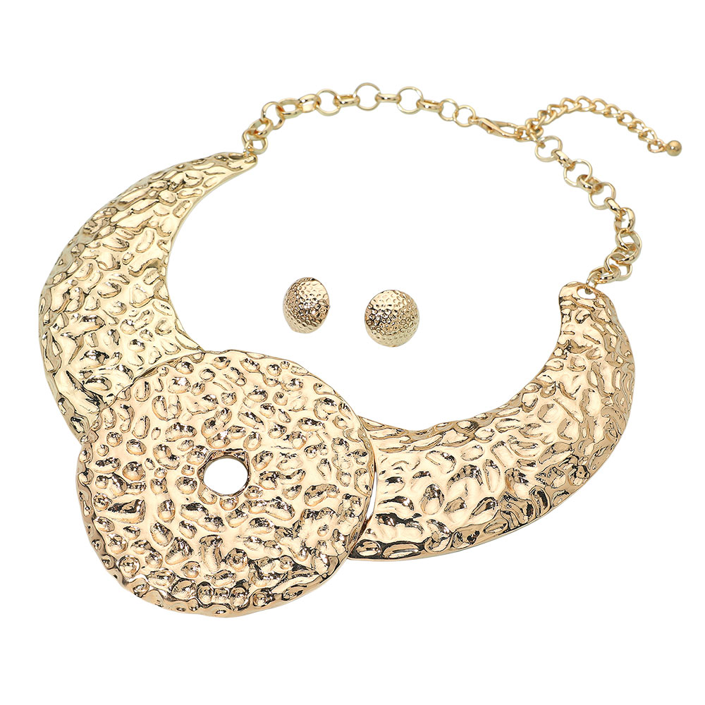Details • Necklace Size : 19" + 3" L • Decor Size : 3.5" L • Earrings Size : 0.7" L • Elevate your look with this hammered statement collar necklace and matching earrings. Featuring bold, sculpted textures and a striking circular centerpiece, this set exudes modern elegance—perfect for adding a touch of artistic sophistication to any outfit. • Lead and Nickel Compliant