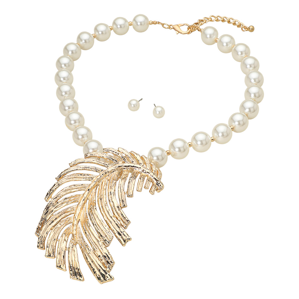 Details • Necklace Size : 20" + 3" L • Decor Size : 4.5" L • Earrings Size : 0.4" L • Add sophisticated charm with this pearl leaf pendant necklace and matching stud earring set designed to blend classic elegance with bold detail. Featuring a beaded strand and sculpted leaf focal point, it’s perfect for special occasions or elevated everyday wear, offering coordinated style and timeless appeal. • Lead and Nickel Compliant