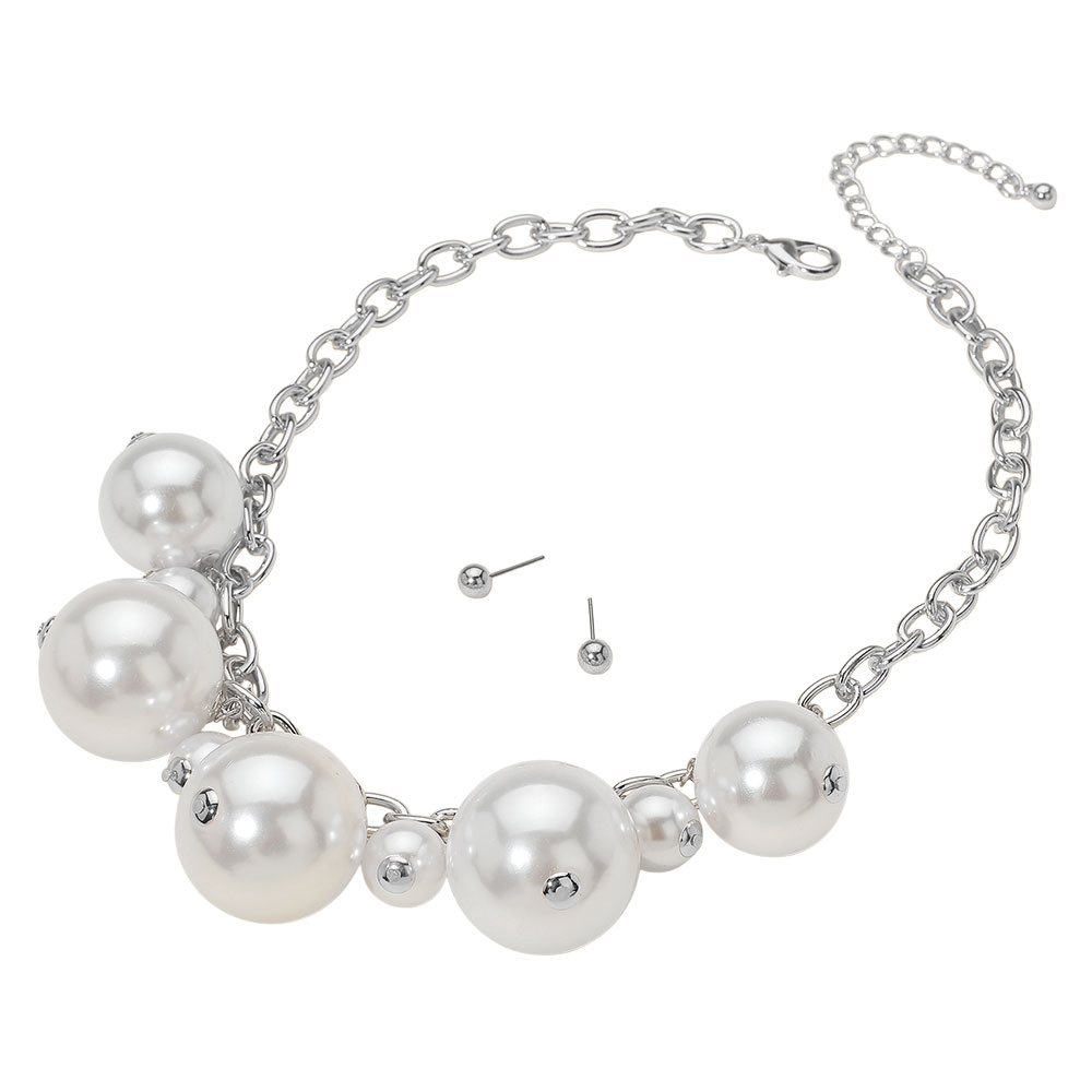 Details • Necklace Size : 18" + 3" L • Decor Size : 1.75" L • Earrings Size : 0.25" L • This elegant faux pearl statement necklace features large and small pearls arranged on a sleek chain for a bold, sophisticated look. Paired with matching stud earrings, it’s the perfect set for weddings, parties, or any occasion that calls for timeless elegance and charm. • Lead and Nickel Compliant