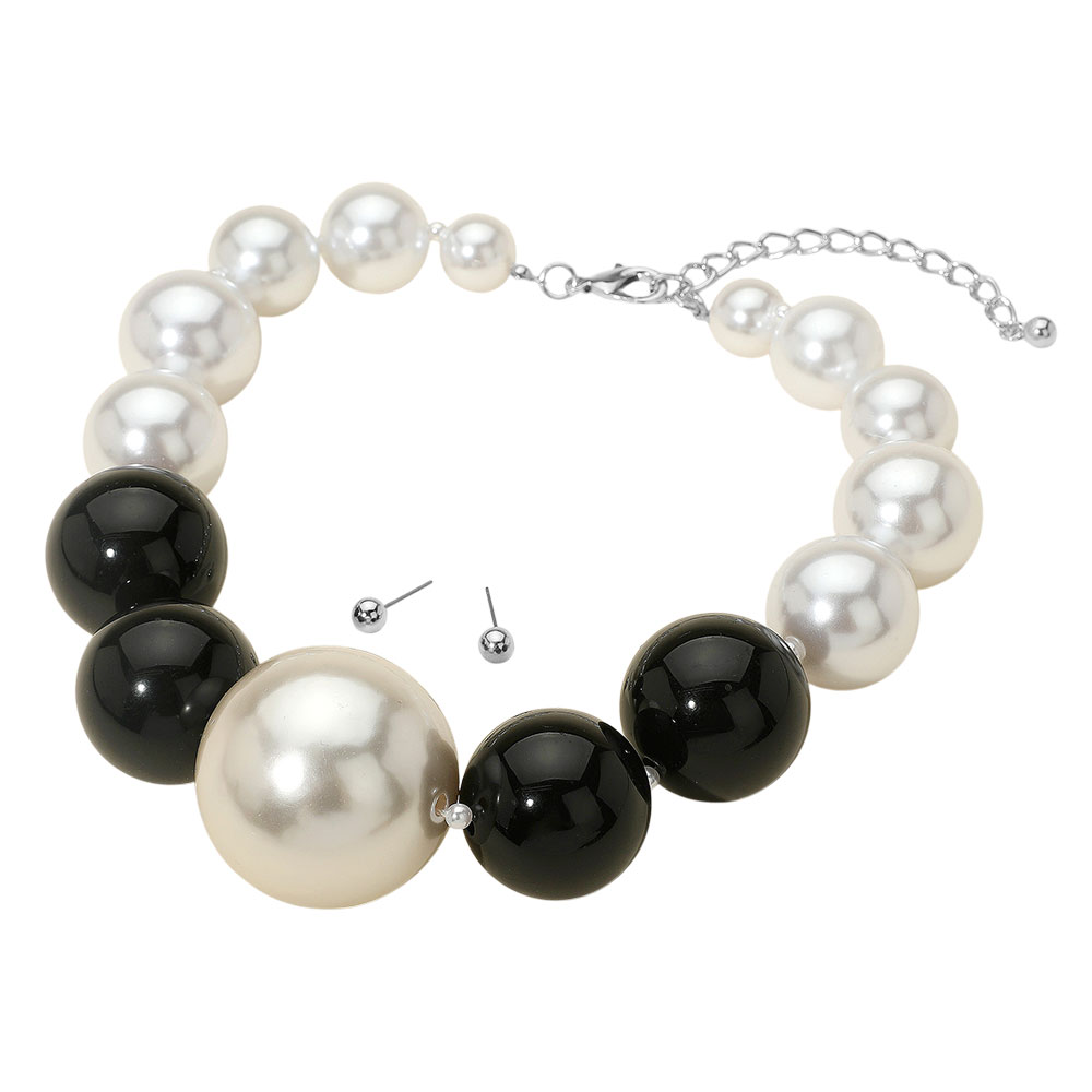 Details • Necklace Size : 16.5" + 3" L • Decor Size : 1.5" L • Earrings Size : 0.25" L • Elevate any look with this bold necklace and stud earring set featuring an eye-catching mix of contrasting oversized and graduated beads. A versatile, modern, and elegant accessory that transitions seamlessly from day to night, perfect for parties, weddings, or special occasions. • Lead and Nickel Compliant