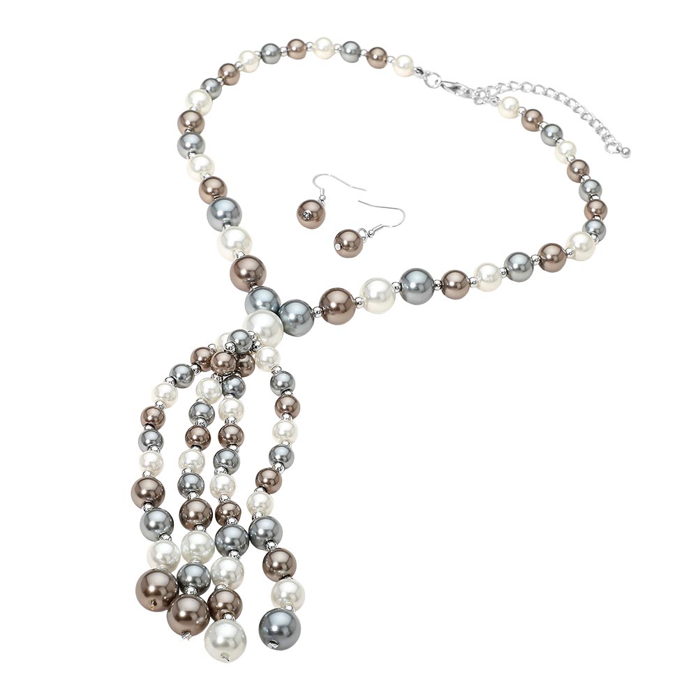 • Elegant bead necklace and earring set featuring graduated pearl-style beads and a cascading tassel centerpiece for a refined, statement look. Perfect for dressing up special occasions or adding a polished touch to everyday outfits. A coordinated set that offers timeless charm and sophisticated style.