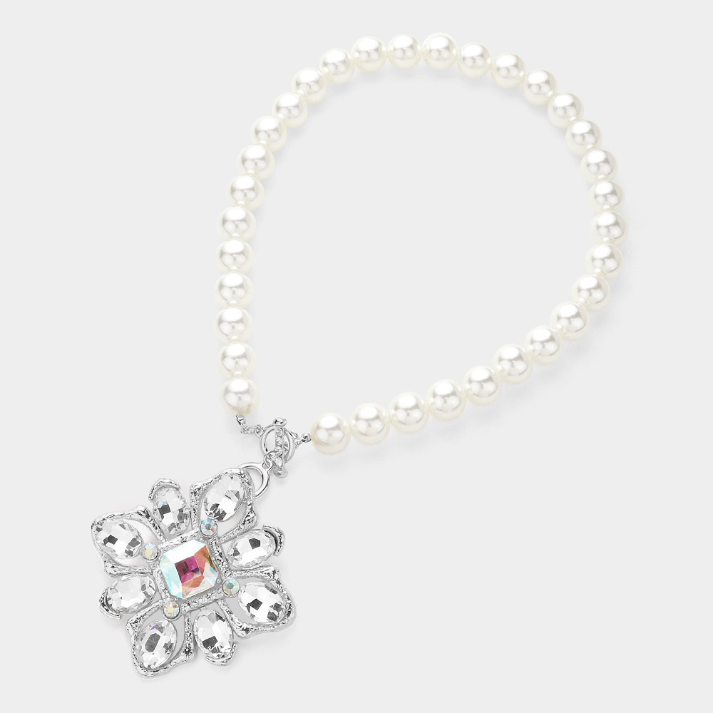 Square Oval Glass Stone Embellished Pendant Accent Toggle Pearl Statement Necklace