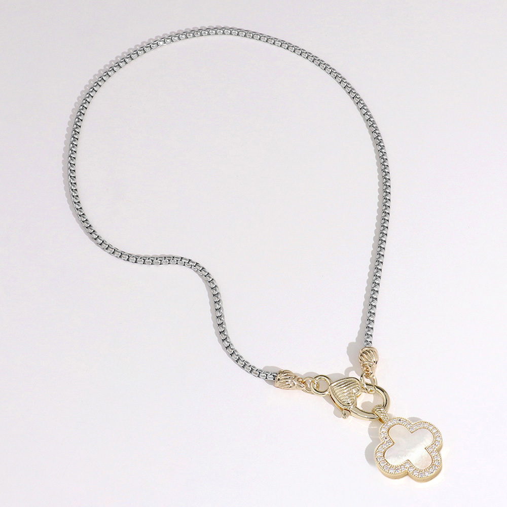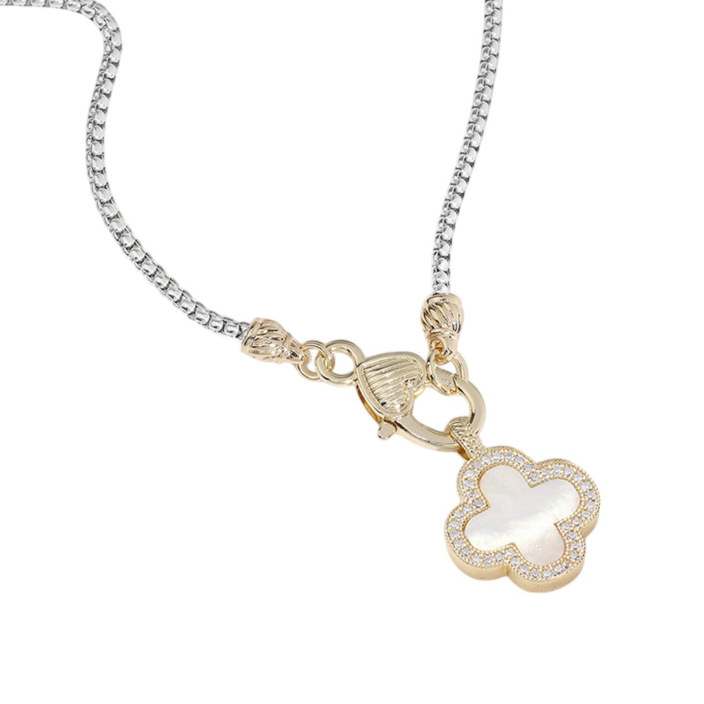 Details • Necklace Size : 17" L • Pendant Size : 0.8" X 1.25" • Enhance your style with this refined dual-tone necklace featuring a delicate mother of pearl quatrefoil pendant accented with subtle sparkle. Its sophisticated design adds a touch of elegance to any look, making it a versatile accessory for both everyday wear and special occasions. • Gold Dipped • CZ Cubic Zirconia