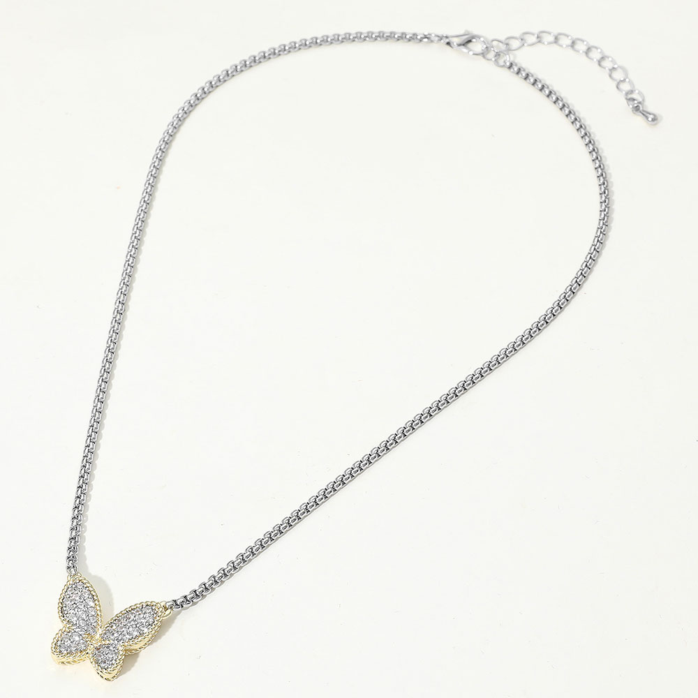 Details • Necklace Size : 16.5" + 2.25" L • Pendant Size : 0.8" X 0.75" • This butterfly pendant necklace features shimmering accents and a sleek chain design, offering a delicate and graceful look. Ideal for adding a subtle statement to both everyday and dressy outfits. • CZ Cubic Zirconia • Gold Dipped