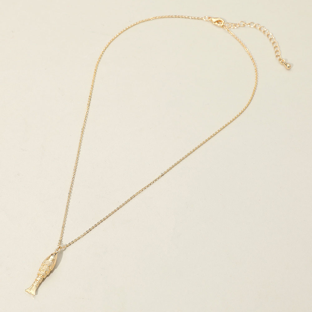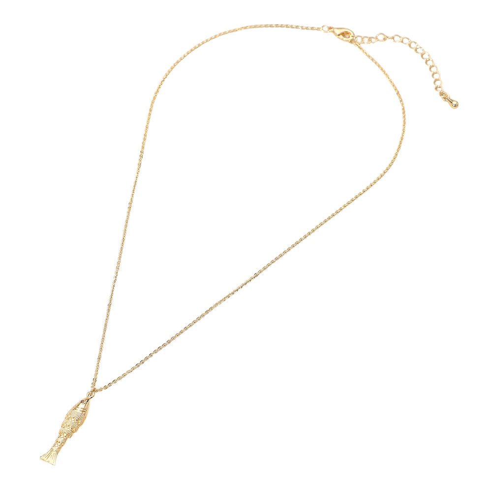 Details • Necklace Size : 16" + 2.5" L • Pendant Size : 0.25" X 1.2" • Tarnish resistant • Necklace featuring an intricately designed fish pendant with fine detailing along the chain. A unique piece that adds a creative and aquatic-inspired flair to everyday wear or layered jewelry collections. • CZ Cubic Zirconia • Gold Dipped • Lead and Nickel Compliant • Made In Korea