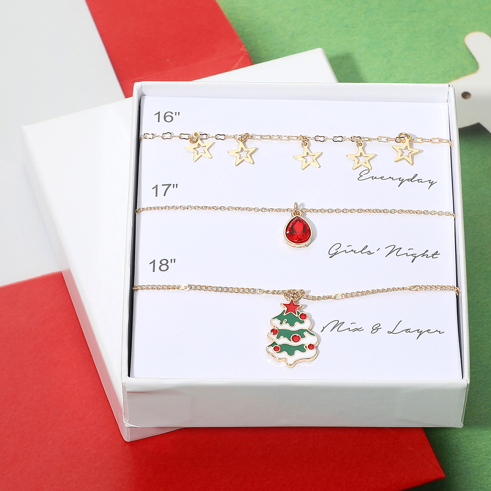 Details • Size 1 : 0.4" L, 16" + 2" L • Size 2 : 0.3" X 0.5, 17" + 2" L • Size 3 : 0.6" X 0.8", 18" + 2" L • Lobster Clasp Closure • Celebrate the season with this three-piece necklace set featuring star charms, a sparkling teardrop pendant, and a festive holiday accent. Designed for layering or wearing solo, this versatile set makes the perfect accessory or thoughtful gift for adding seasonal cheer and elegance. • Lead and Nickel Compliant