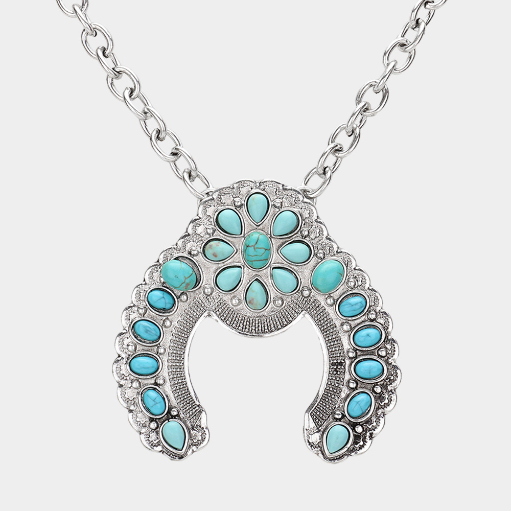 Details • Necklace Size : 19" + 2.25" L • Pendant Size : 2.5" X 2.6" • Bold and beautifully crafted silver-tone necklace featuring a crescent-shaped pendant with intricate engraving and vibrant turquoise stones in a floral and teardrop pattern. A stunning Southwestern piece that radiates vintage charm and boho elegance. • Lead and Nickel Compliant