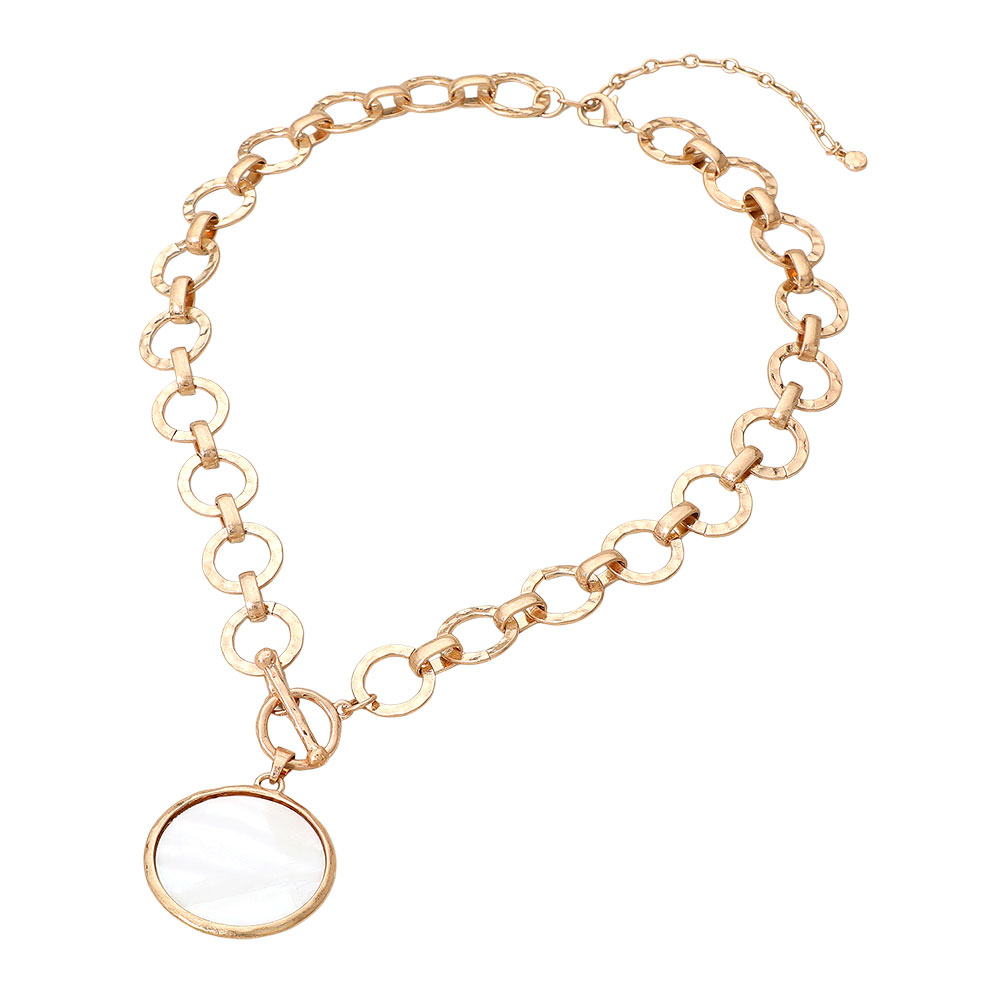 Details • Necklace Size : 18" + 3" L • Pendant Size : 1.4" X 1.4" • Toggle Closure • Add a touch of elegance to your style with this hammered link chain necklace featuring a stunning mother of pearl pendant. Designed for both sophistication and edge, this piece is ideal for evening wear or everyday glamour, making it a standout addition to any jewelry collection. • Lead and Nickel Compliant