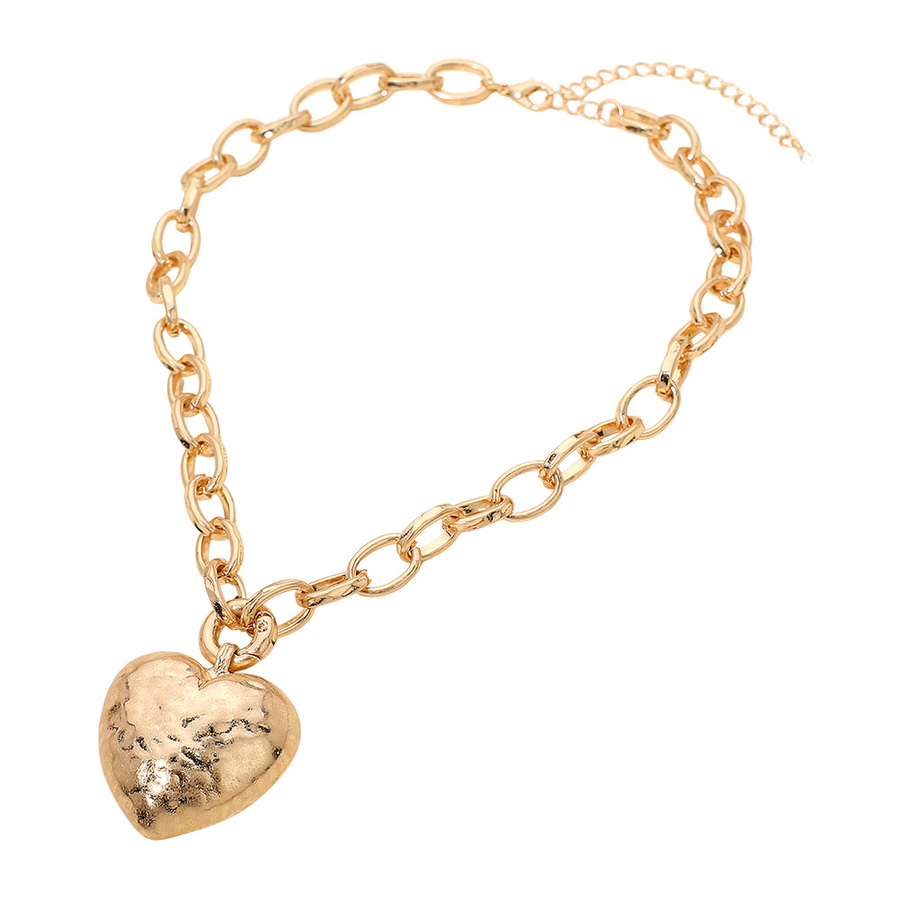 Details • Necklace Size : 15.5" + 3" L • Pendant Size : 1.4" X 1.5" • A bold, stylish necklace featuring a chunky linked chain paired with a textured heart pendant for a striking yet romantic touch. Its statement design elevates everyday looks and adds expressive charm to dressier outfits, making it a versatile standout accessory. • Lead and Nickel Compliant