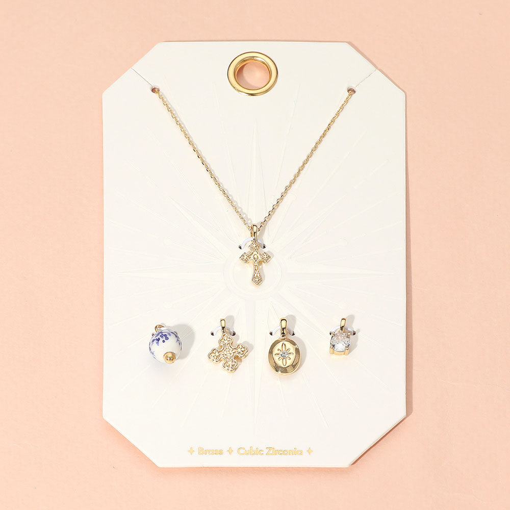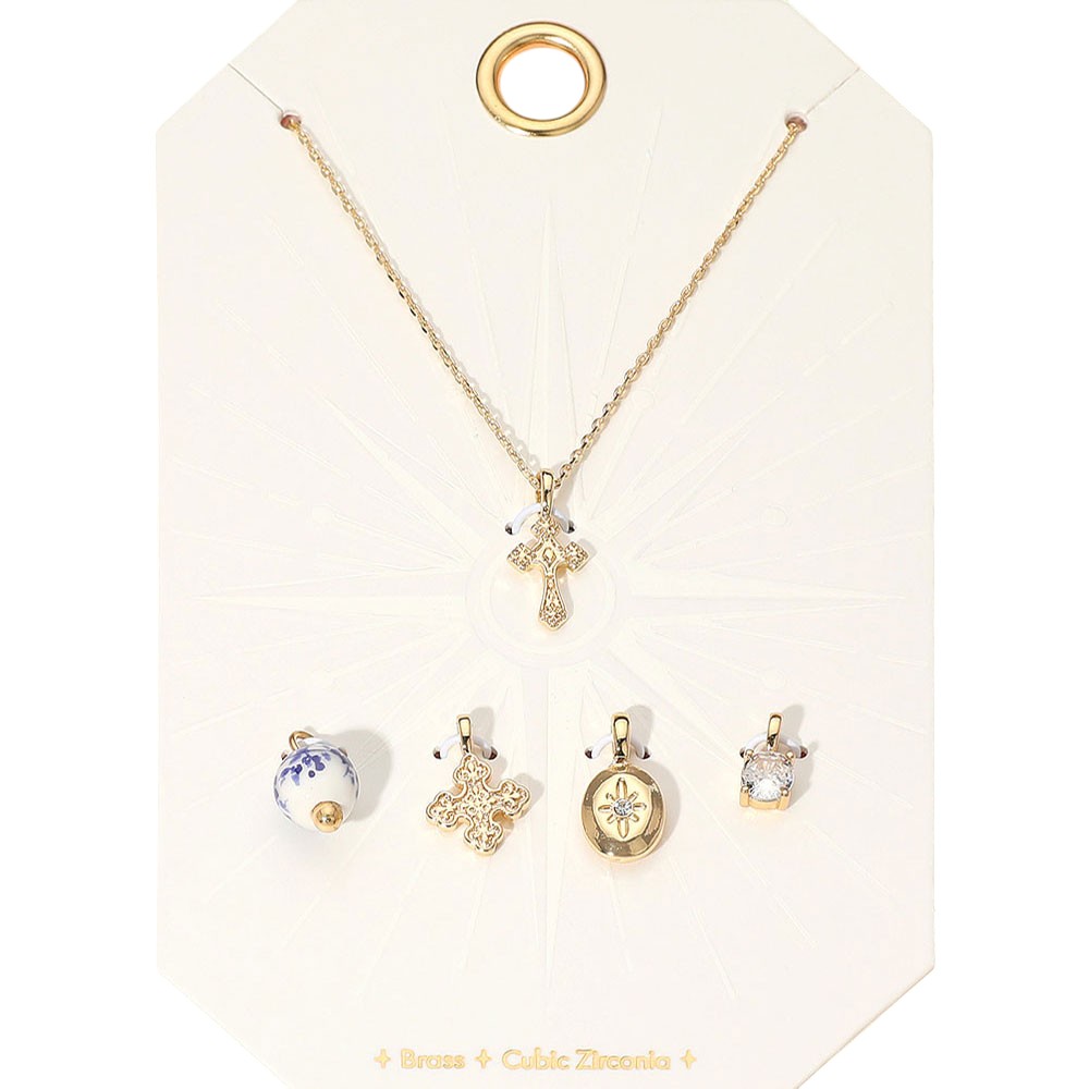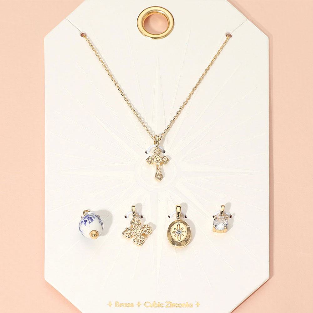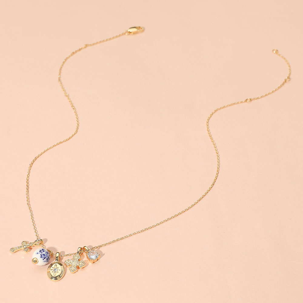 Details • Necklace Size : 15" + 2.25" L • Pendant Size : 0.3" - 0.7" L (5PCS) • Elegant necklace featuring five unique charms including crosses, a medallion, gem, and decorative bead. A versatile accessory for spiritual, classic, or personalized everyday wear. Ideal for gifting or self-expression. • Brass • CZ Cubic Zirconia