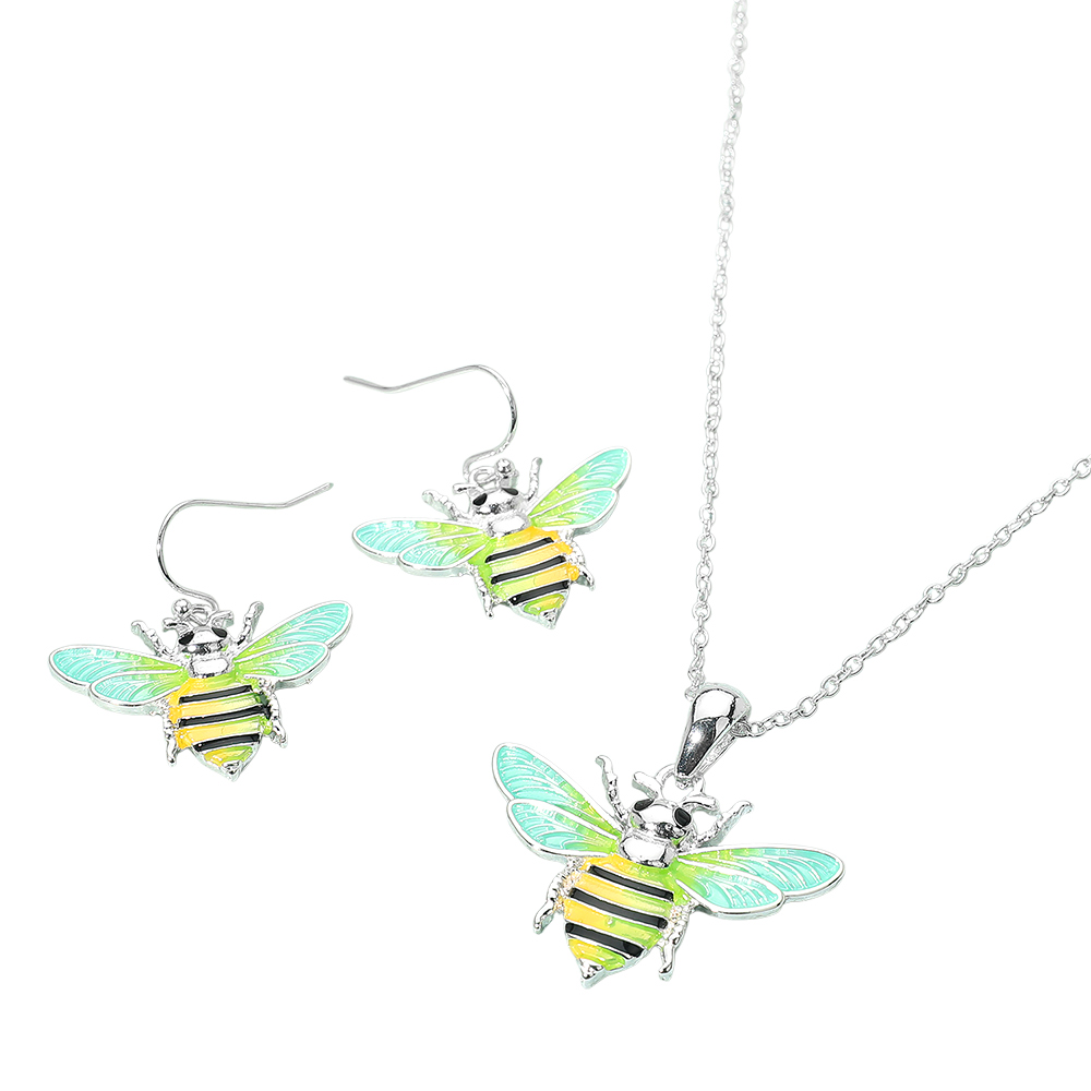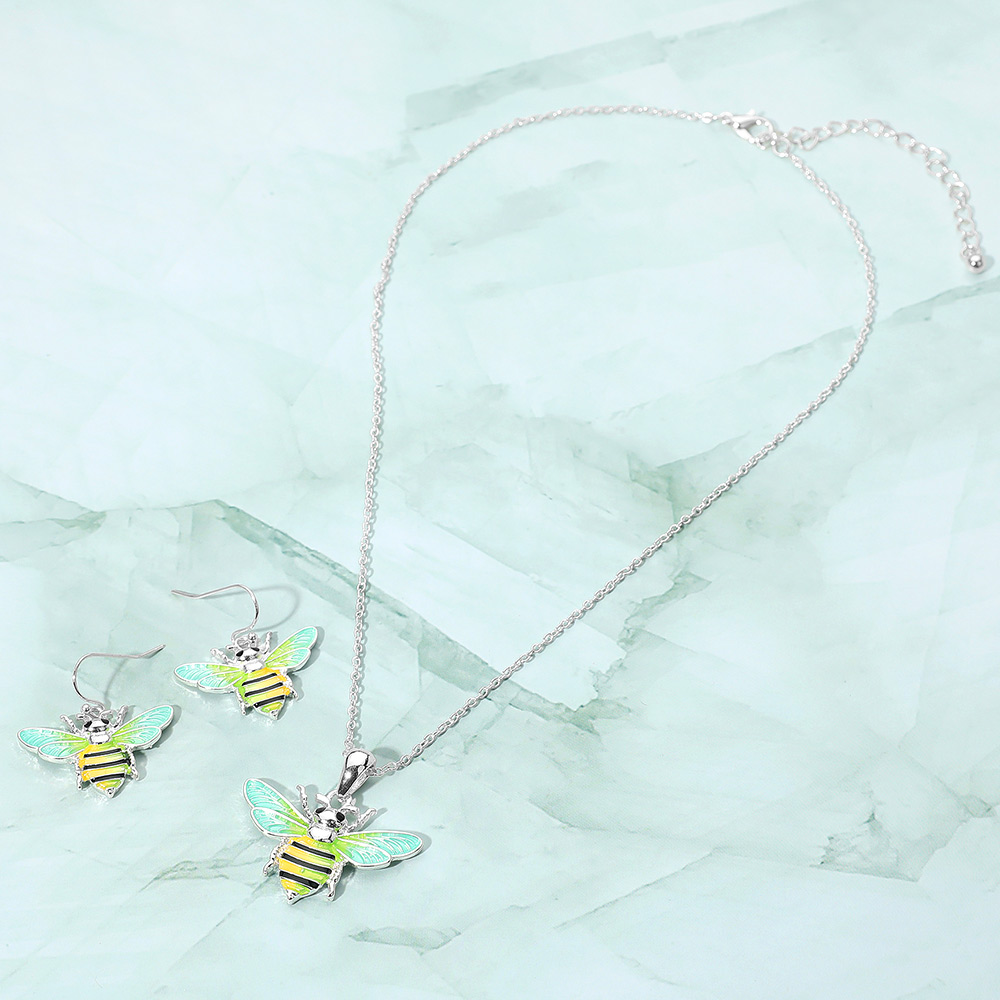 Details • Necklace Size : 18" + 3.25" L • Pendant Size : 1.3" X 1.25" • Earrings Size : 1.1" L • This honey bee enamel necklace and earring set radiates charm and positivity with its playful, nature-inspired design. Representing hard work and harmony, this matching set adds a vibrant, uplifting touch to your style—perfect for daily wear or gifting to someone who inspires joy. • Lead and Nickel Compliant