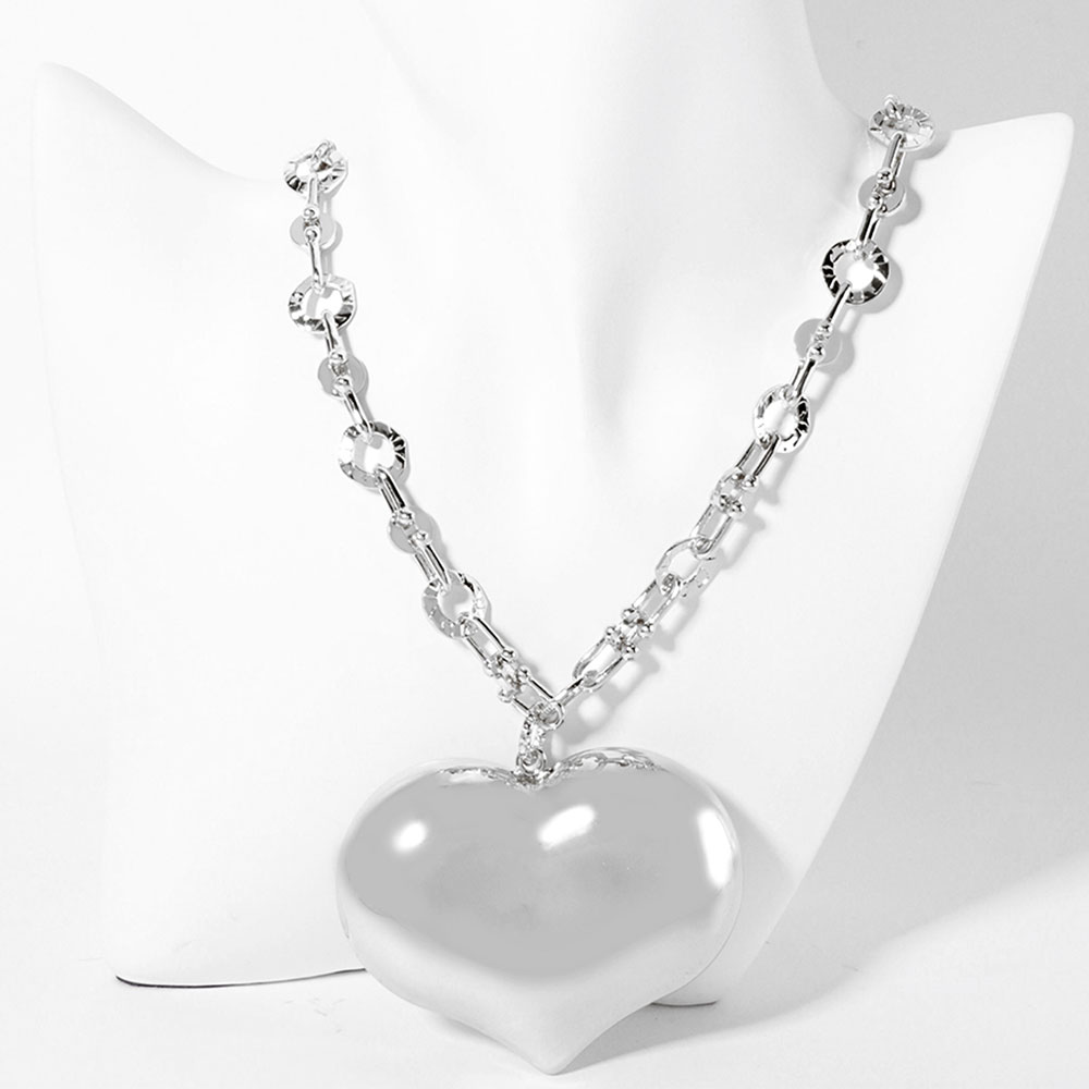 Details • Necklace Size : 18" + 1" L • Pendant Size : 2.75" X 2.25" • Statement heart pendant necklace with sleek chain detailing creates a modern romantic look for everyday or special occasions. Designed to sit beautifully at the neckline, it adds standout shine and effortless elegance to layered or solo jewelry styling. • Gold Dipped • Lead and Nickel Compliant • Made In Korea