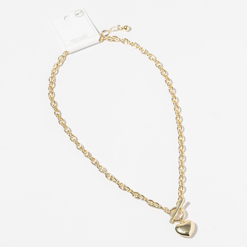 Details • Necklace Size : 18" + 1" L • Pendant Size : 0.7" X 0.5" • Elevate your everyday style with this toggle heart charm chain necklace featuring a smooth, polished pendant on a bold link chain. Its chic, modern design pairs effortlessly with any outfit, making it a perfect accessory for layering or wearing solo. A stylish gift choice for any occasion. • Gold Dipped • Lead and Nickel Compliant • Made In Korea