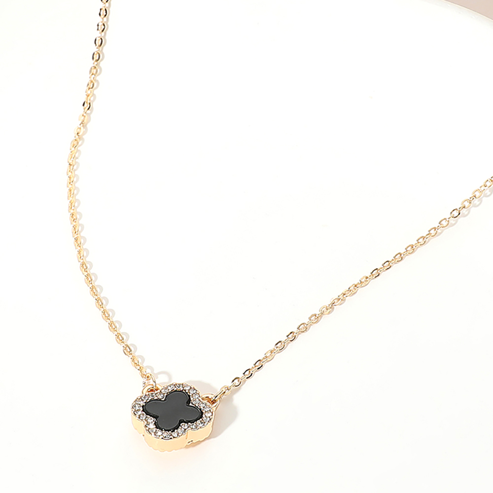 Details • Necklace Size : 16" + 3" L • Pendant Size : 0.5" X 0.5" • This dainty quatrefoil charm pendant necklace showcases a single elegant motif framed by a shimmering border for a refined touch. Its minimalist design and adjustable chain make it perfect for layering or wearing solo, adding a hint of sophistication to both casual and dressy ensembles. • Gold Dipped • Lead and Nickel Compliant