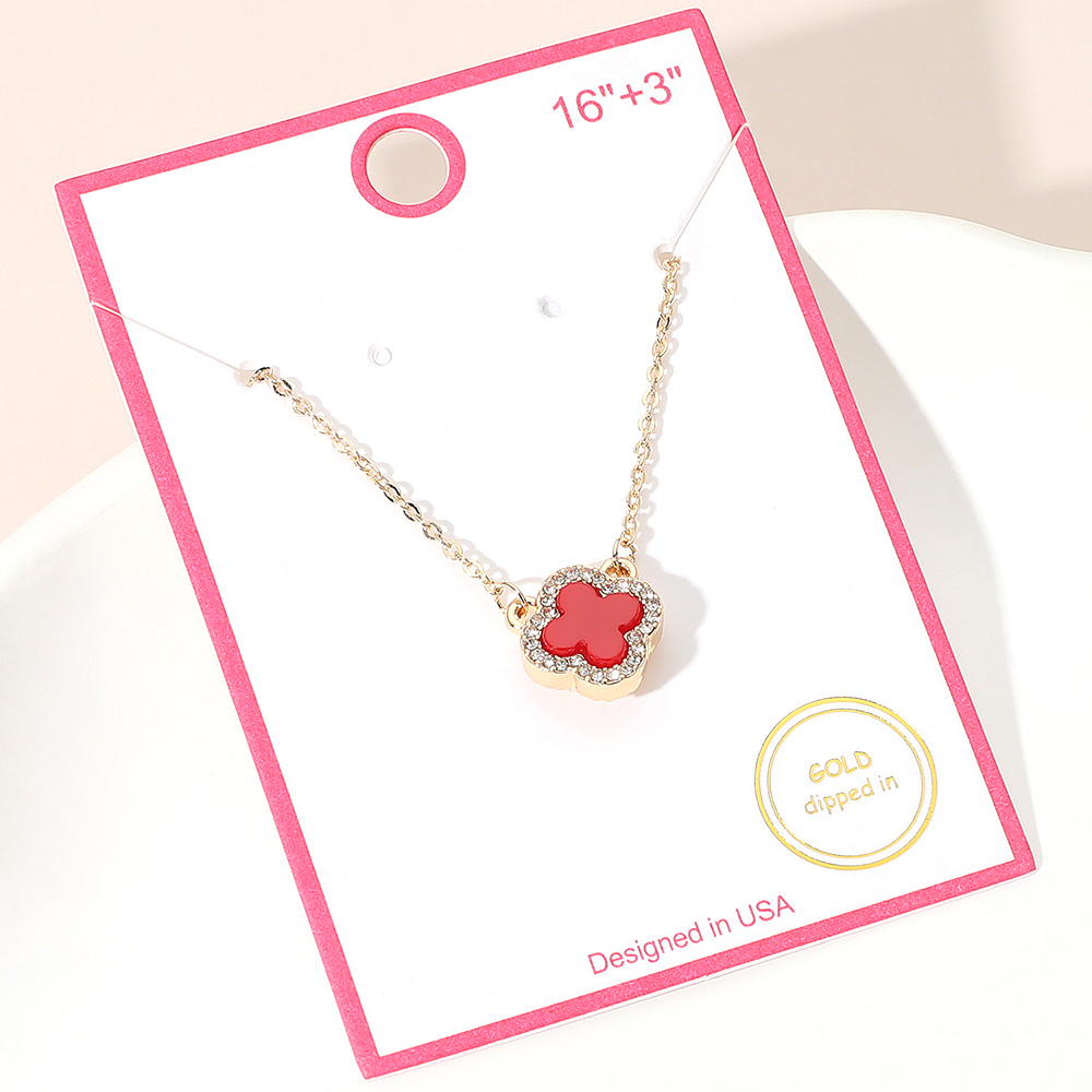 Gold Dipped Rhinestone Trim Quatrefoil Pendant Necklace