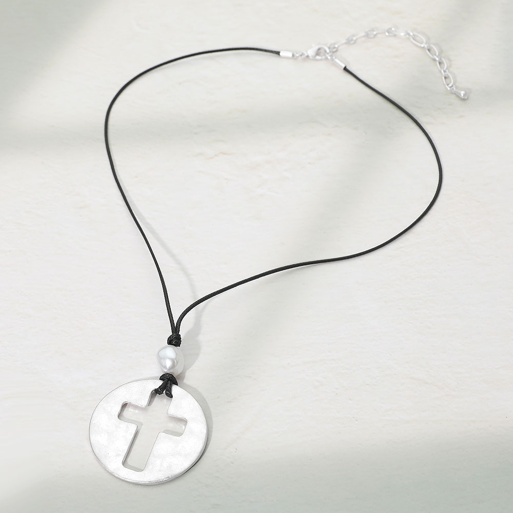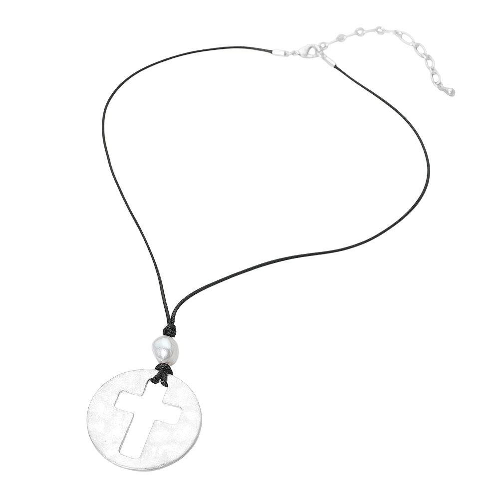 Details • Necklace Size : 17" + 3" L • Pendant Size : 1.6" X 2.2" • Embrace meaningful style with this round pendant necklace featuring a bold cross cut-out for a symbolic touch. Designed with a lightweight cord chain and adjustable closure, it blends faith and fashion for everyday wear. Perfect for layering or as a statement piece with casual or dressy outfits. • Lead and Nickel Compliant