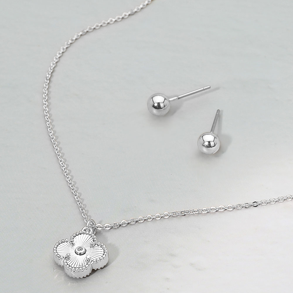 Details • Necklace Size : 16.5" + 2.25" L • Pendant Size : 0.5" X 0.6" • Earrings Size : 0.2" L • Chic four-leaf quatrefoil necklace set featuring a delicate clover pendant and matching stud earrings. Its elegant design adds a refined touch of charm and sophistication, perfect for daily wear or gifting, symbolizing luck, beauty, and timeless feminine grace. • Lead and Nickel Compliant