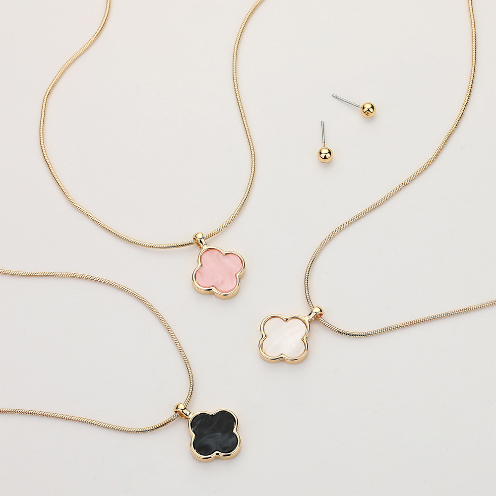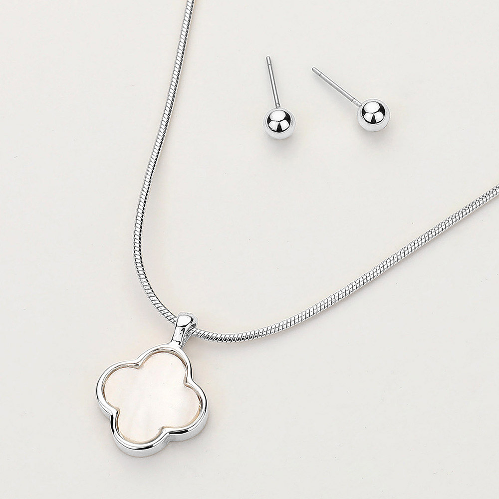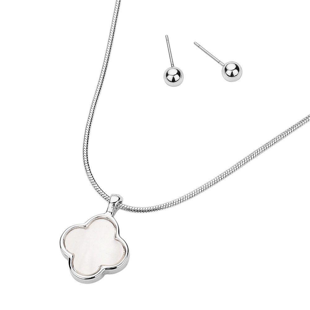 Details • Necklace Size : 16.5" + 2" L • Pendant Size : 0.6" X 0.9" • Earrings Size : 0.2" L • Elegant clover pendant necklace paired with classic stud earrings, designed for a timeless and versatile look. Perfect for daily wear or special occasions, this jewelry set adds sophistication and charm to any outfit, making it a thoughtful gift choice as well. • Lead and Nickel Compliant
