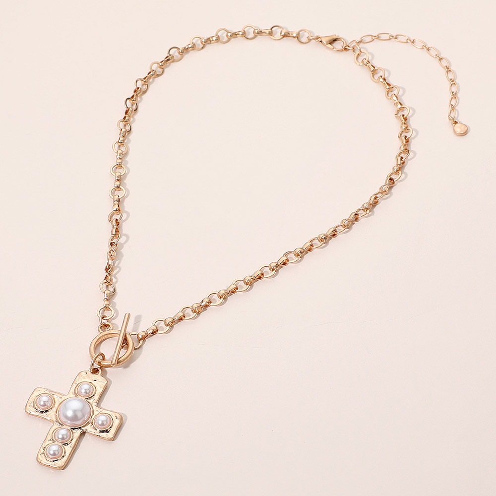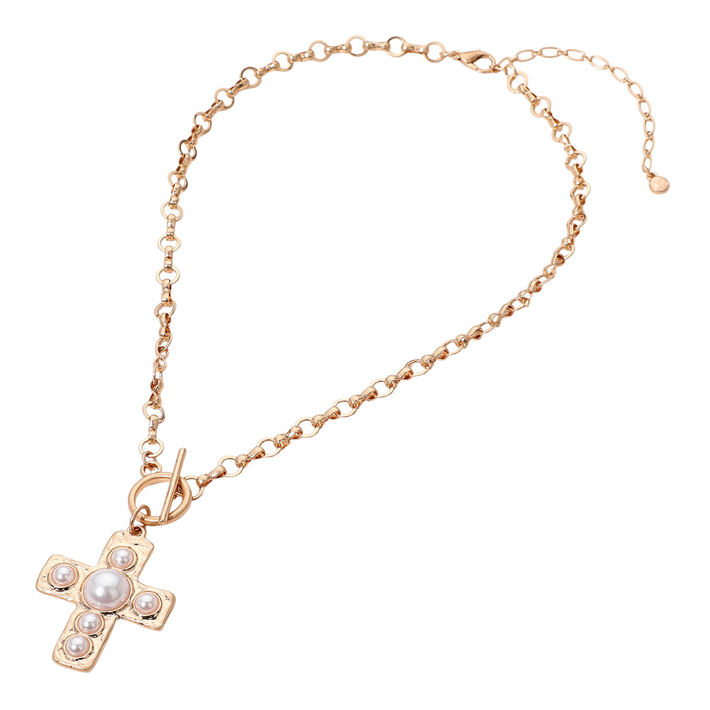 Details • Necklace Size : 15.5" + 3" L • Pendant Size : 1.2" X 1.5" • Elegant cross pendant necklace featuring a textured chain and pearl-accented centerpiece. The toggle clasp detail enhances its stylish design, making it a timeless accessory that adds sophistication and charm to both casual and dressy looks. • Lead and Nickel Compliant