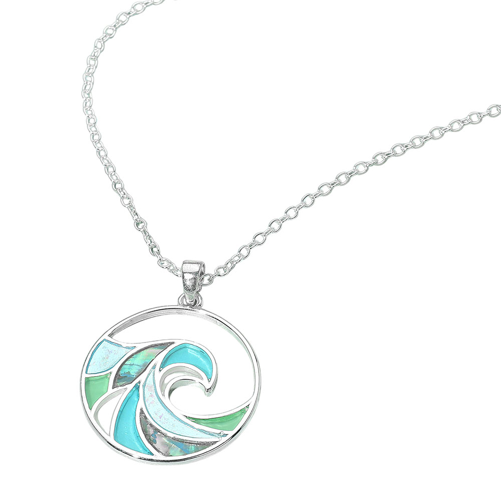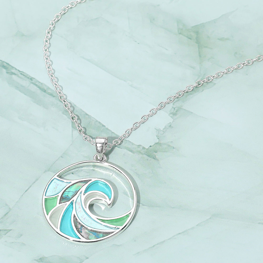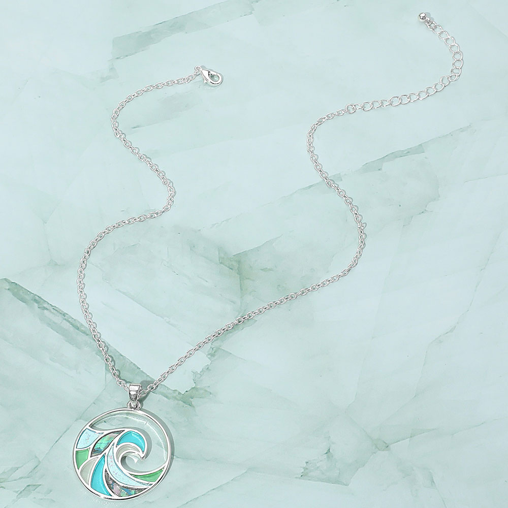 Details • Necklace Size : 16" + 3.25" L • Pendant Size : 1.3" X 1.6" • This ocean wave enamel pendant necklace captures the essence of coastal beauty with its swirling design in soothing blue and green tones. A perfect statement piece for ocean lovers, it adds a serene yet stylish touch to any outfit, evoking the calm and movement of the sea. • Lead and Nickel Compliant