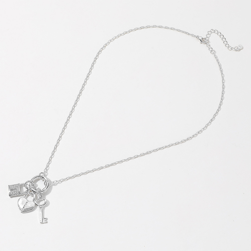 Details • Necklace Size : 16.5" + 2" L • Decor Size : 1.5" L • A playful charm necklace featuring a heart, lock, and key trio that creates a meaningful, stylish statement. The mixed-shape pendants add visual interest, making this piece perfect for daily wear, gifting, or pairing with layered looks for added personality and charm. • Sterling Silver Dipped