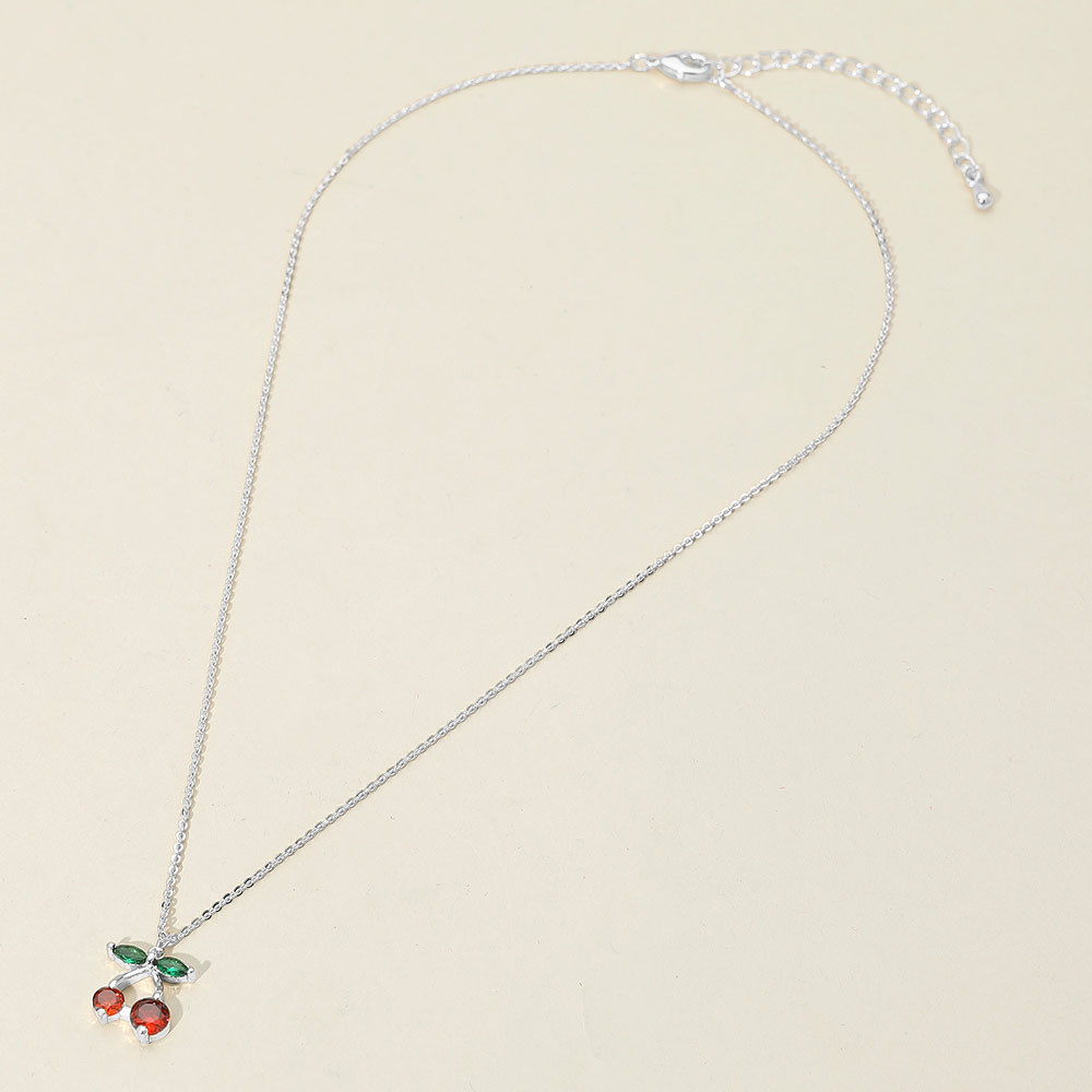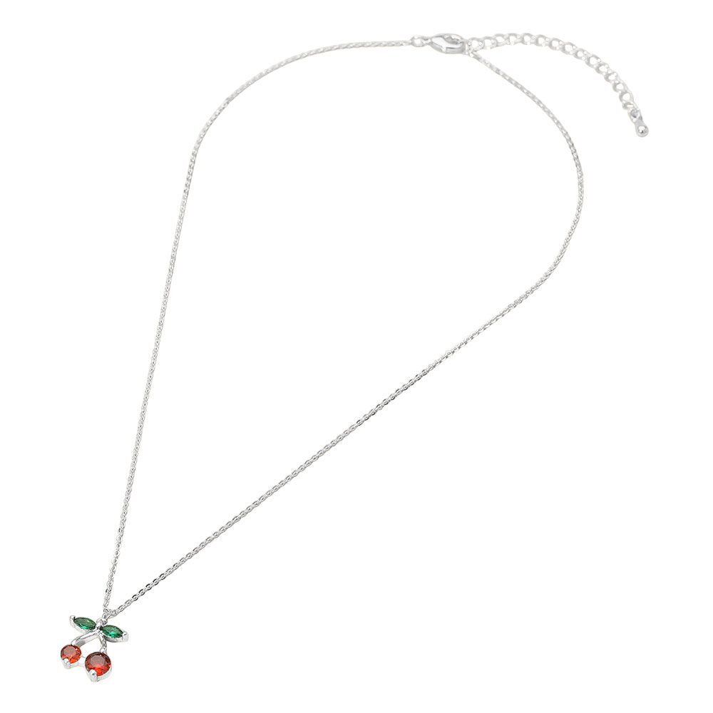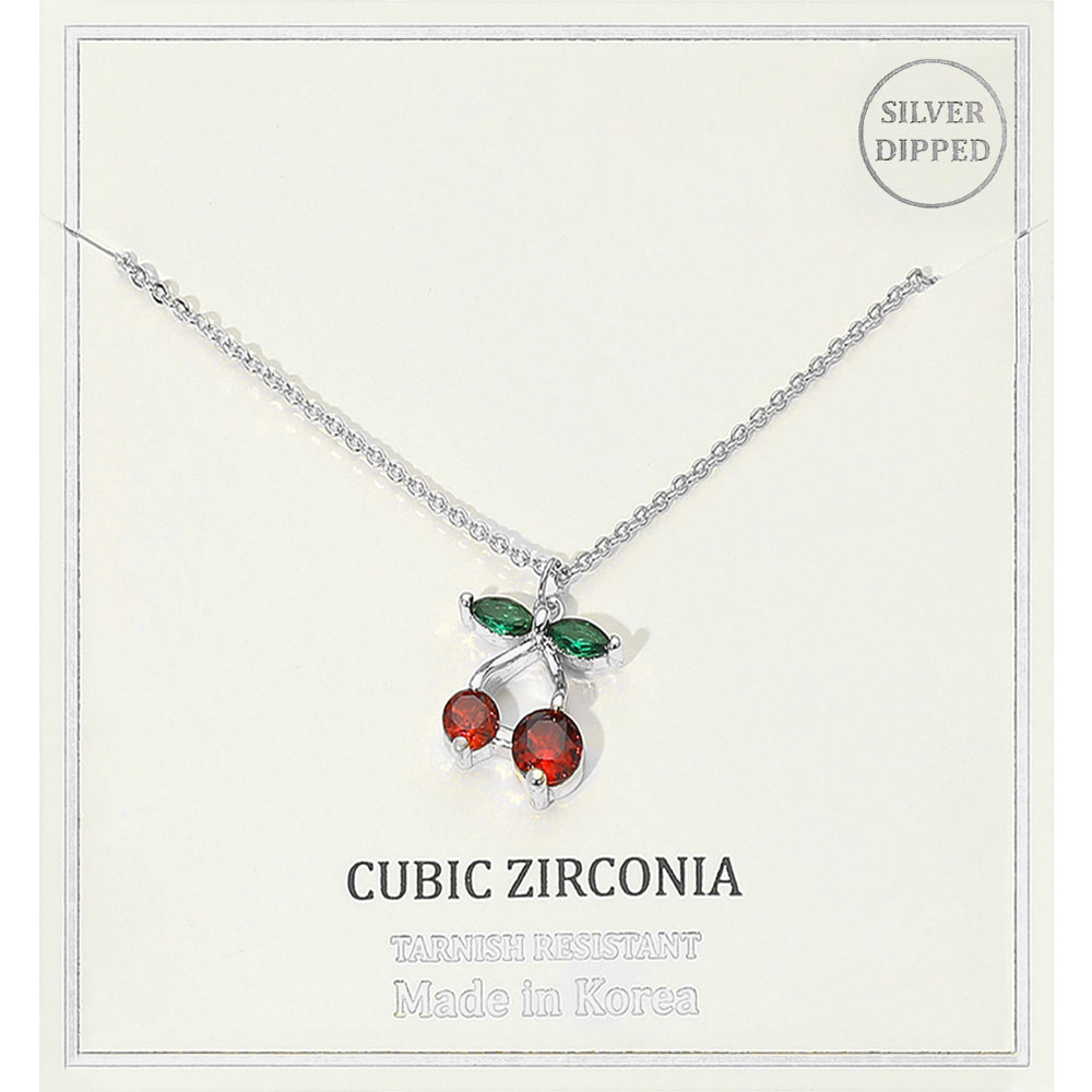 Details • Necklace Size : 16" + 2.5" L • Pendant Size : 0.5" X 0.7" • Tarnish resistant • Playful necklace featuring a cherry pendant with detailed gemstone accents and a dainty chain. A whimsical accessory that adds a fun, fruity touch to casual or trendy looks, perfect for gifting or everyday charm. • Lead and Nickel Compliant • Made In Korea • CZ Cubic Zirconia • Sterling Silver Dipped