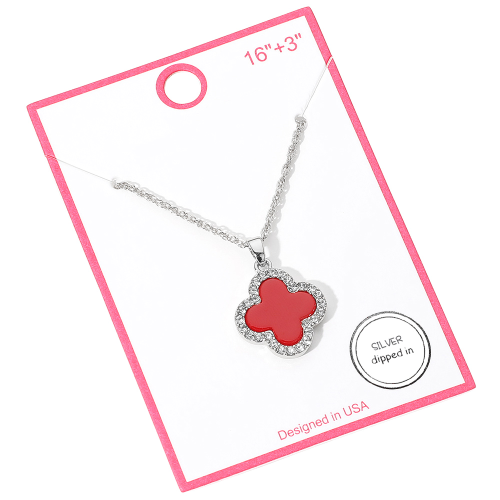 Details • Necklace Size : 16" + 3" L • Pendant Size: 0.75" X 1" • This radiant quatrefoil outline pendant necklace features a hollow design surrounded by shimmering stones for a touch of elegance. Its delicate chain and timeless silhouette create a versatile accessory that complements both everyday wear and special occasions with effortless charm. • Sterling Silver Dipped • Lead and Nickel Compliant