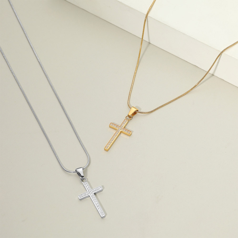 18K Gold Dipped Stainless Steel Stone Paved Cross Pendant Necklace