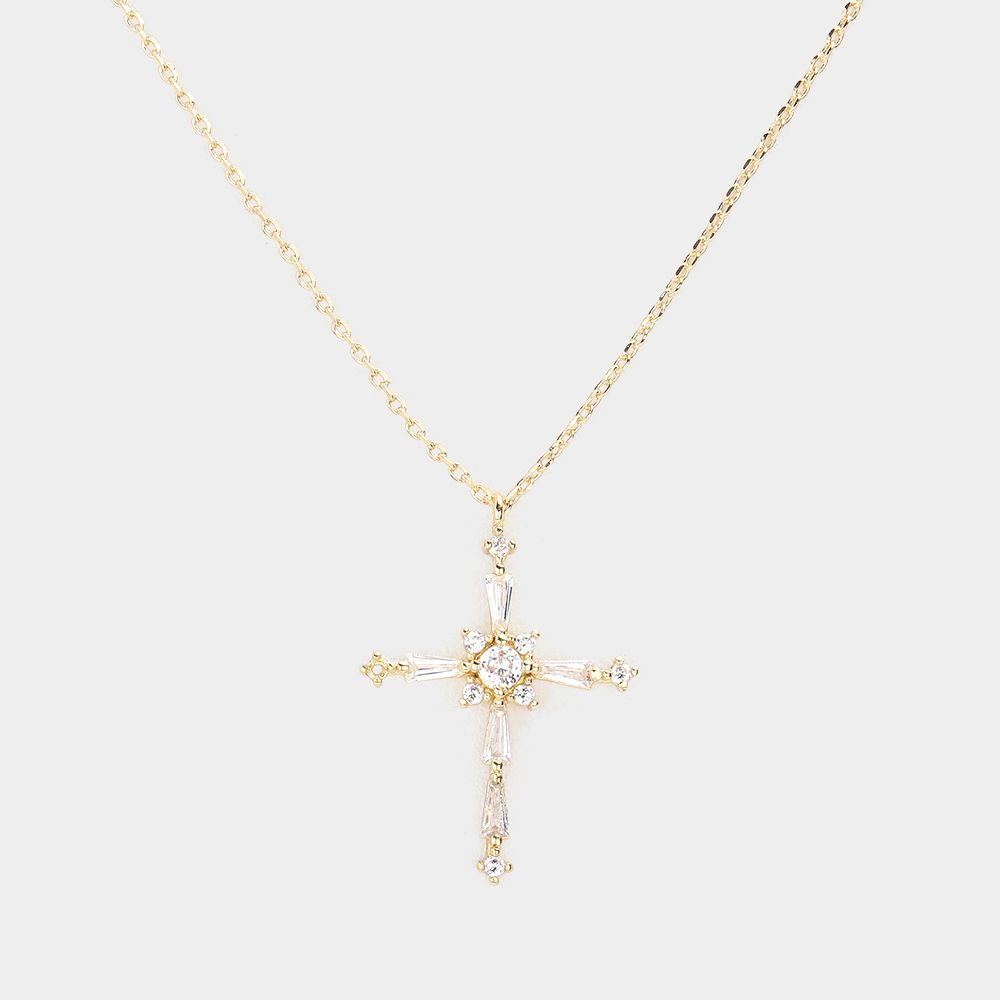 Stone Paved Mother of Pearl Cross Charm Pendant Necklace