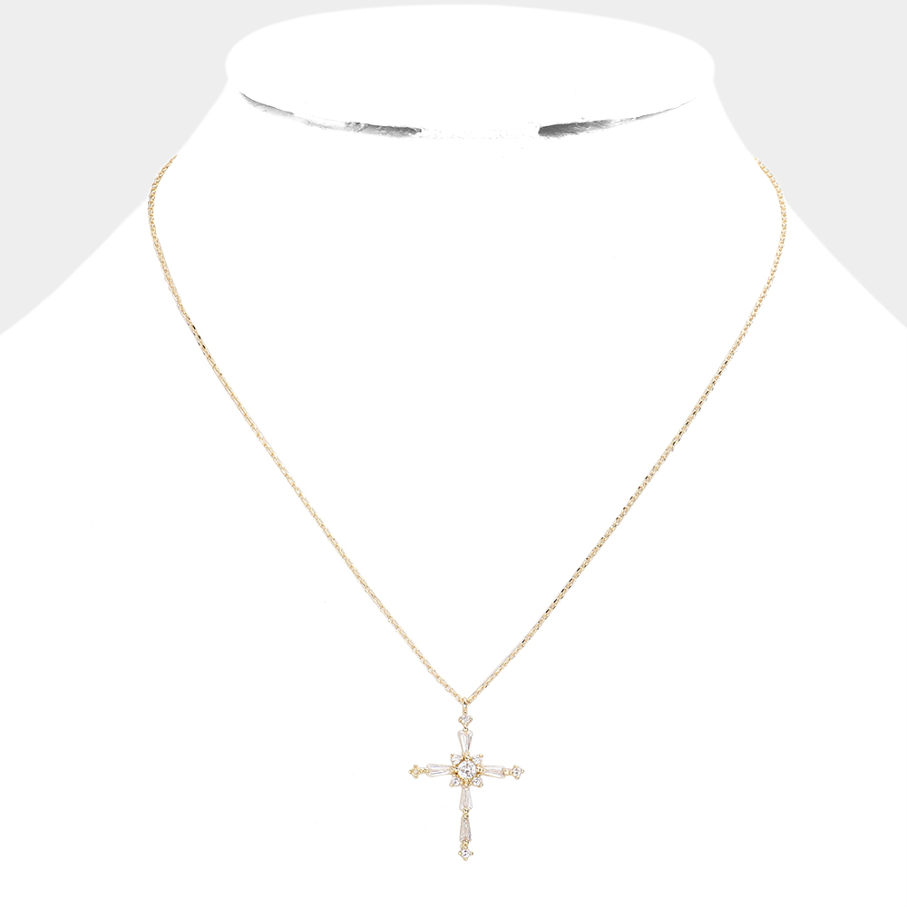 14K Gold Plated CZ Stone Cluster Cross Pendant Chunky Paperclip Chain Necklace