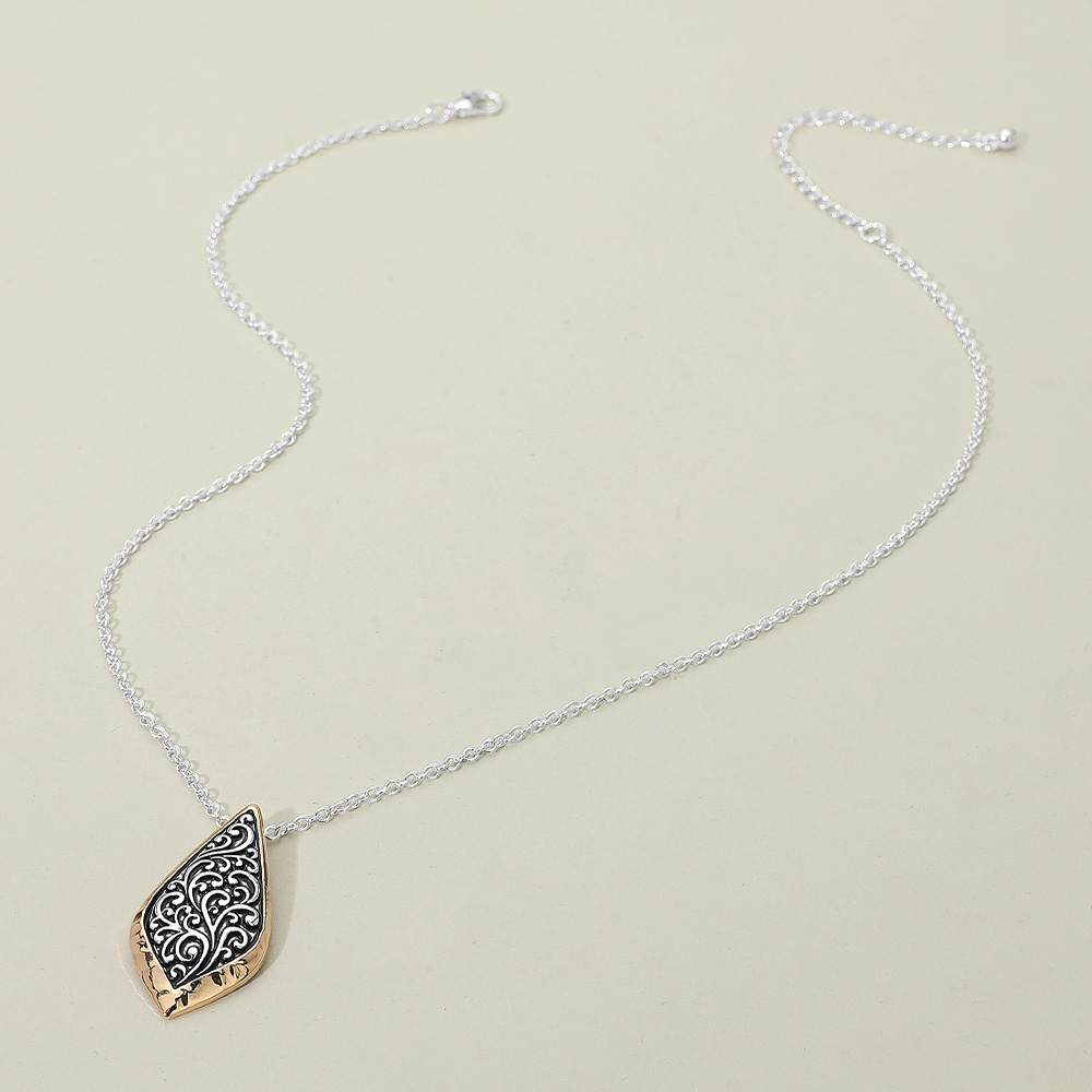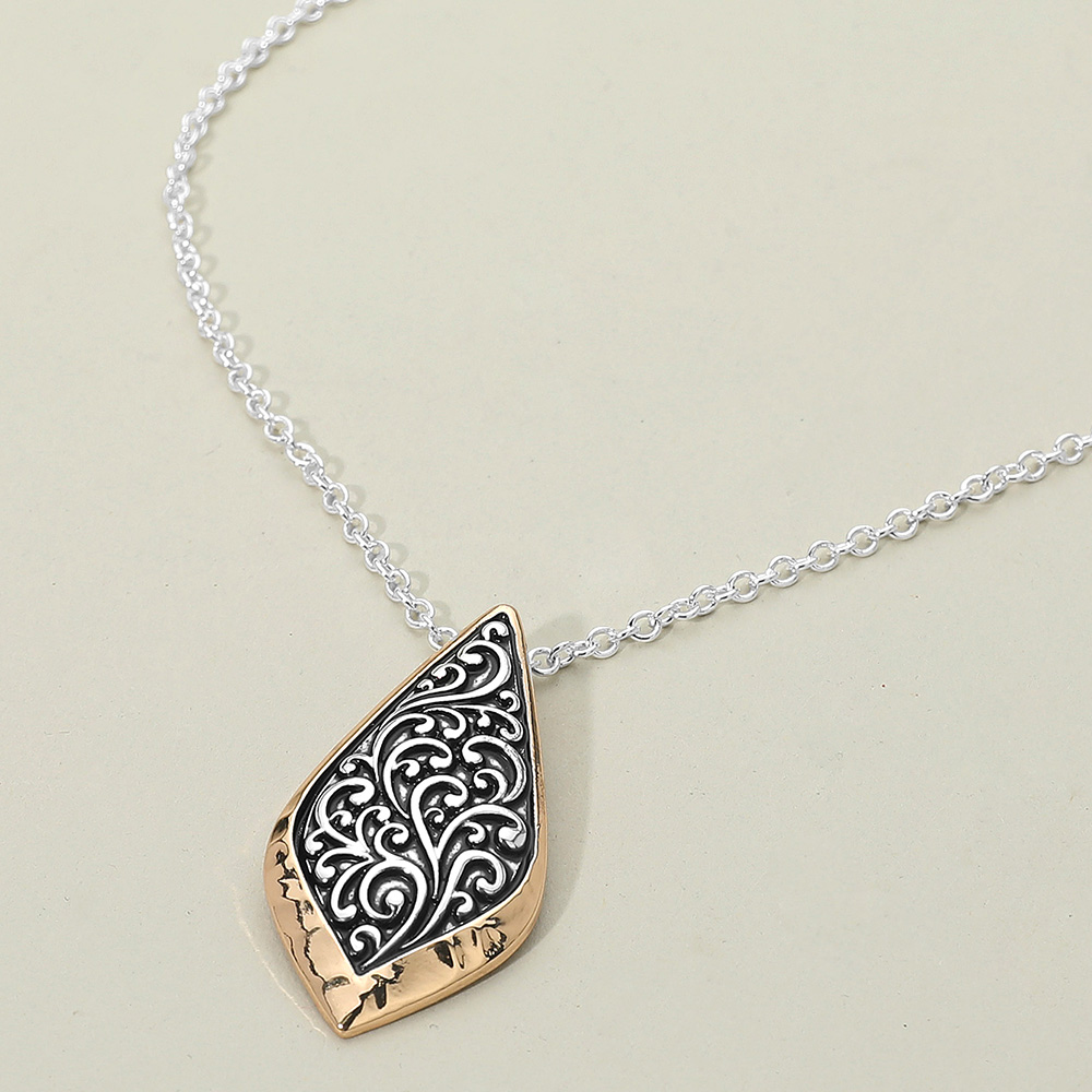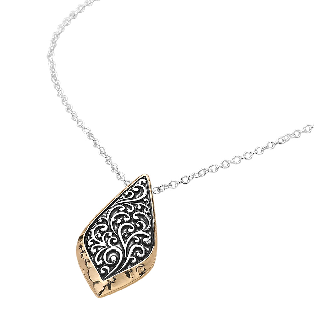 Details • Necklace Size : 18" + 3.5" L • Pendant Size : 0.8" X 1.6" • Elevate your look with this artisan leaf pendant necklace featuring an elegant scrollwork pattern and refined two-tone finish. Its unique craftsmanship blends classic artistry with modern sophistication, making it a standout accessory for any occasion. • Lead and Nickel Compliant
