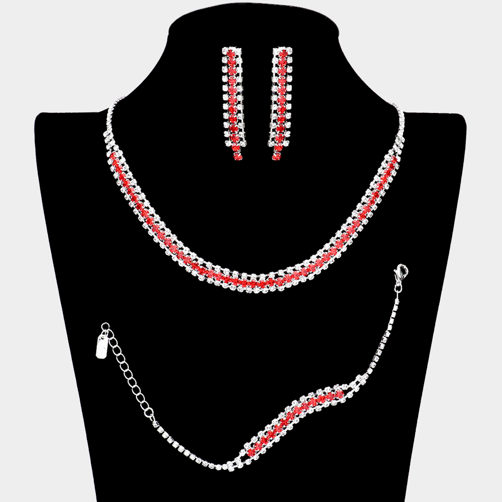 Details • Necklace Size : 16" + 4" L • Decor Size : 0.3" L • Bracelet Size : 0.3" H, 7" + 2" L • Earrings Size : 1.9" L • Elevate your style with this elegant rhinestone jewelry set, featuring a sparkling necklace, matching bracelet, and drop earrings. Perfect for weddings, parties, or evening occasions, this coordinated trio adds timeless radiance and refined sophistication to any ensemble.