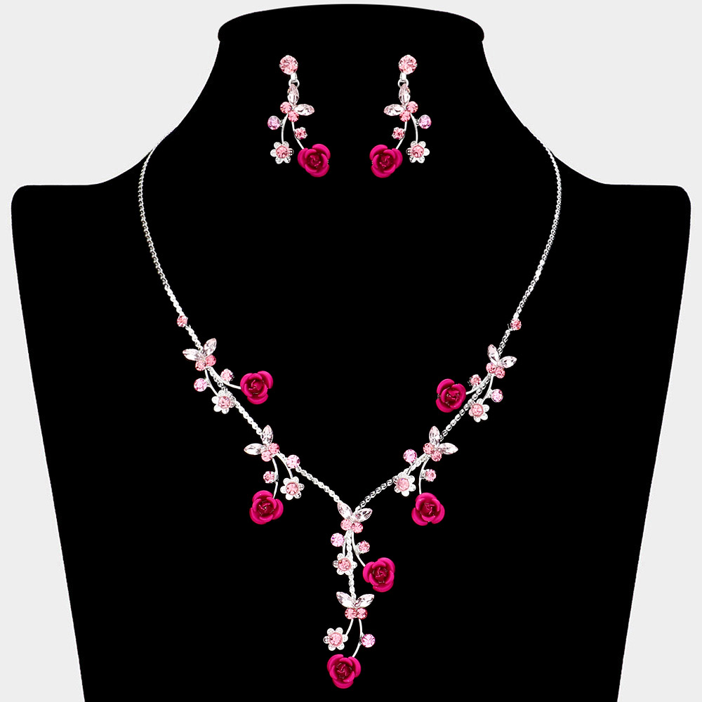 Colored Rose Vine Butterfly Stone Cluster Rhinestone Paved Necklace