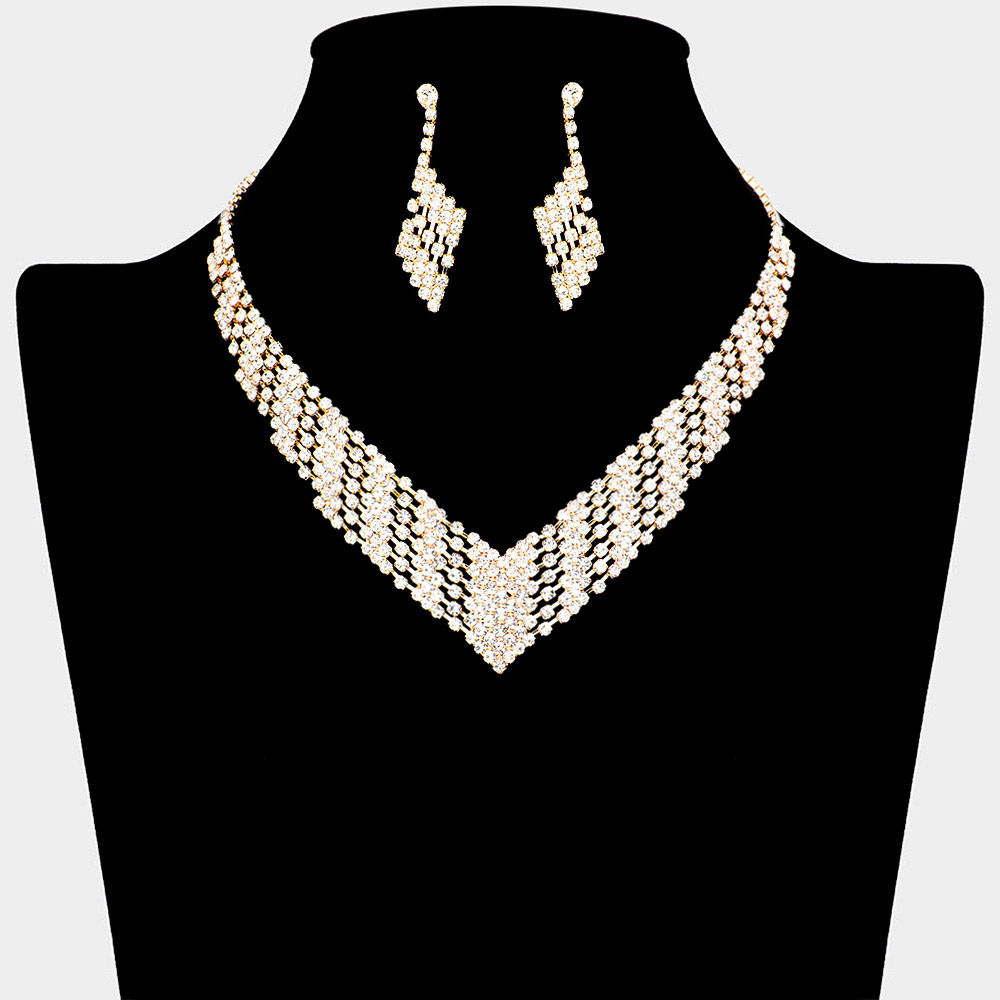 Details • Necklace Size : 13.5" L + 4.5" L • Decor Size : 0.8" L • Earring Size : 1.7" L • Shine with sophistication in this V-Pattern Crystal Statement Necklace and Earring Set. Featuring a cascading geometric design that catches the light beautifully, this glamorous duo adds timeless sparkle and elegance—perfect for weddings, galas, or unforgettable evening occasions. • Lead and Nickel Compliant