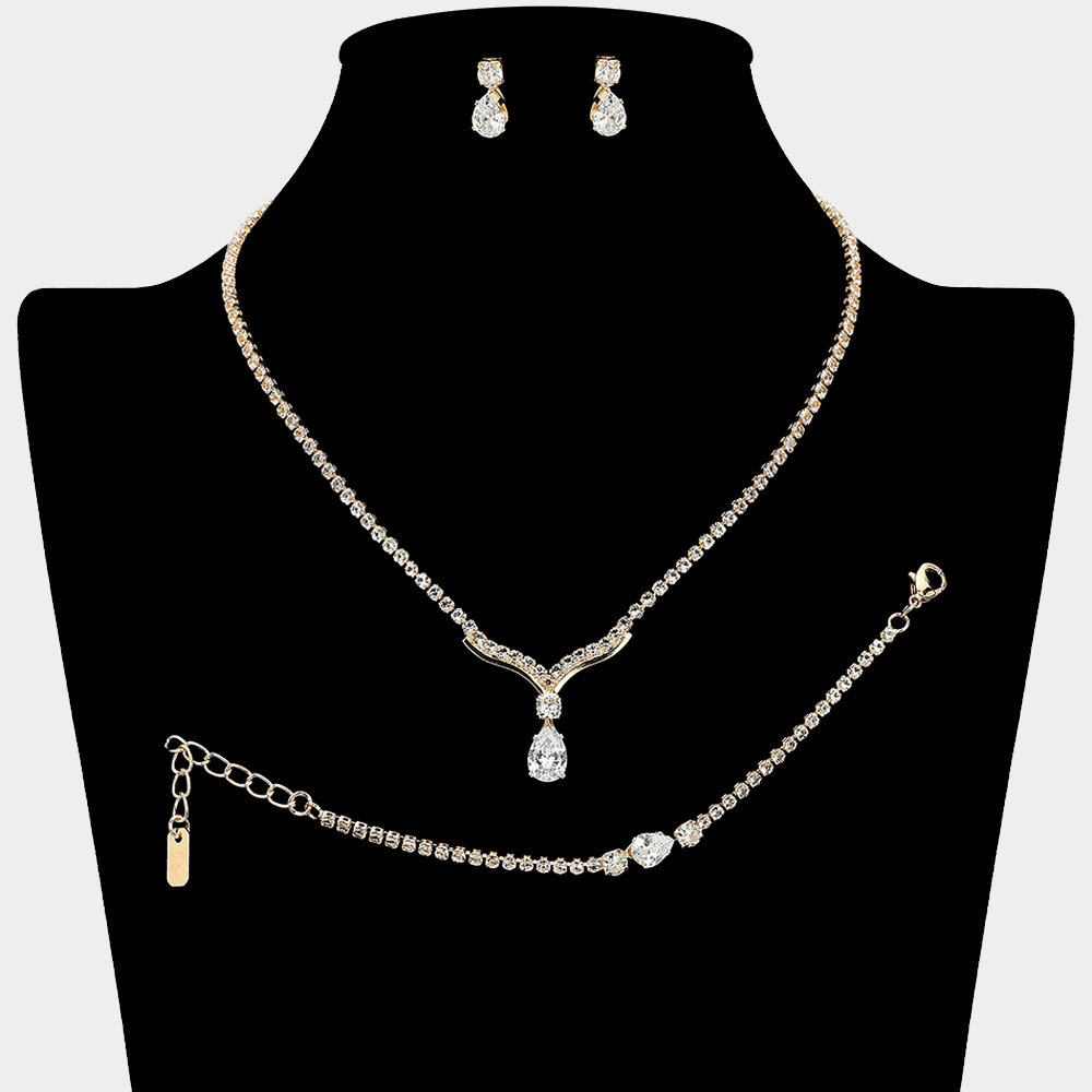 Details • Necklace Size : 16" + 4.75" L • Decor Size : 0.8" L • Bracelet Size : 0.3" H, 5.5" + 2.25" L • Earrings Size : 0.4" L • Add a touch of timeless elegance with this three-piece jewelry set featuring a delicate teardrop pendant necklace, matching drop earrings, and a coordinating bracelet. Perfect for weddings, proms, and evening occasions, this sparkling set enhances any formal or special event look. • CZ Cubic Zirconia