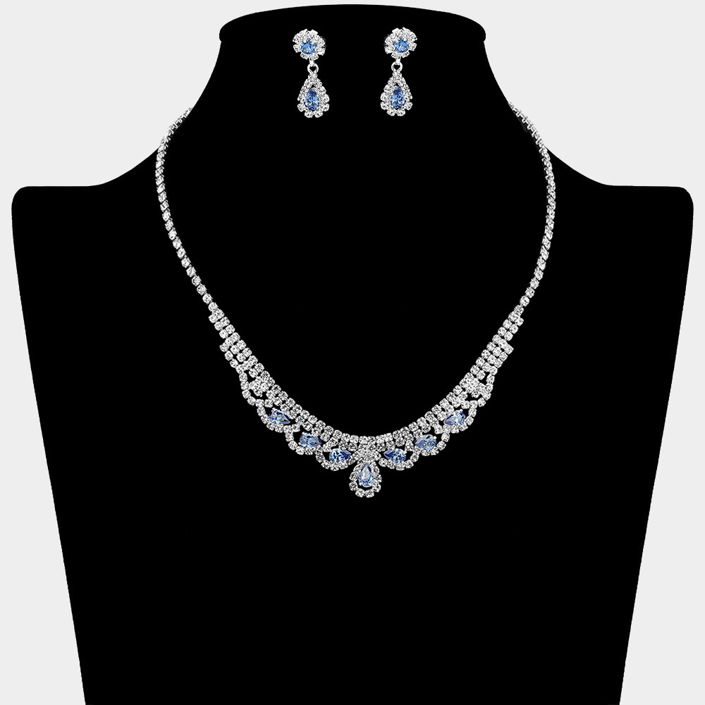 Details • Necklace Size : 15" + 4.5" L • Decor Size : 0.6" L • Earrings Size : 1" L • Shine at any special occasion with this teardrop crystal necklace and earring set. Featuring a layered design with sparkling accents, it adds elegance and sophistication to bridal, prom, or evening looks. A striking accessory set for standout style. • CZ Cubic Zirconia