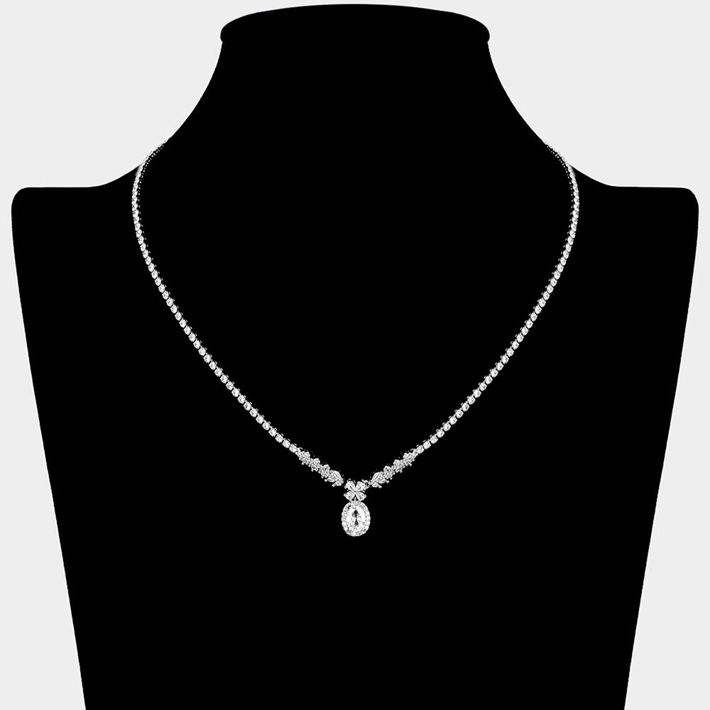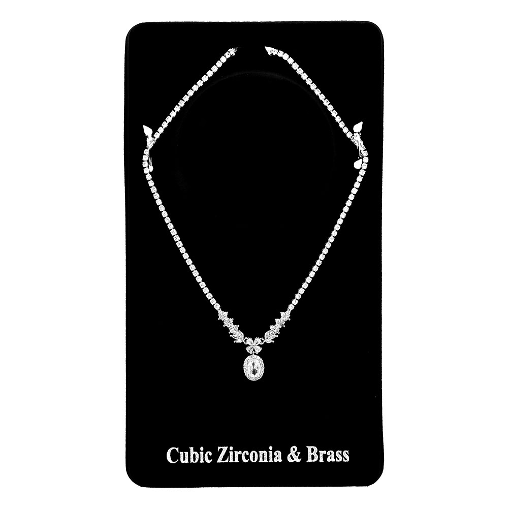 Details • Necklace Size : 16" + 2" L • Decor Size : 0.7" L • Sparkling necklace featuring a delicate rhinestone chain with a floral-inspired cluster leading to a oval pendant. A timeless piece for weddings, formal evenings, and special occasions, adding sophistication and refined glamour. • Brass • CZ Cubic Zirconia