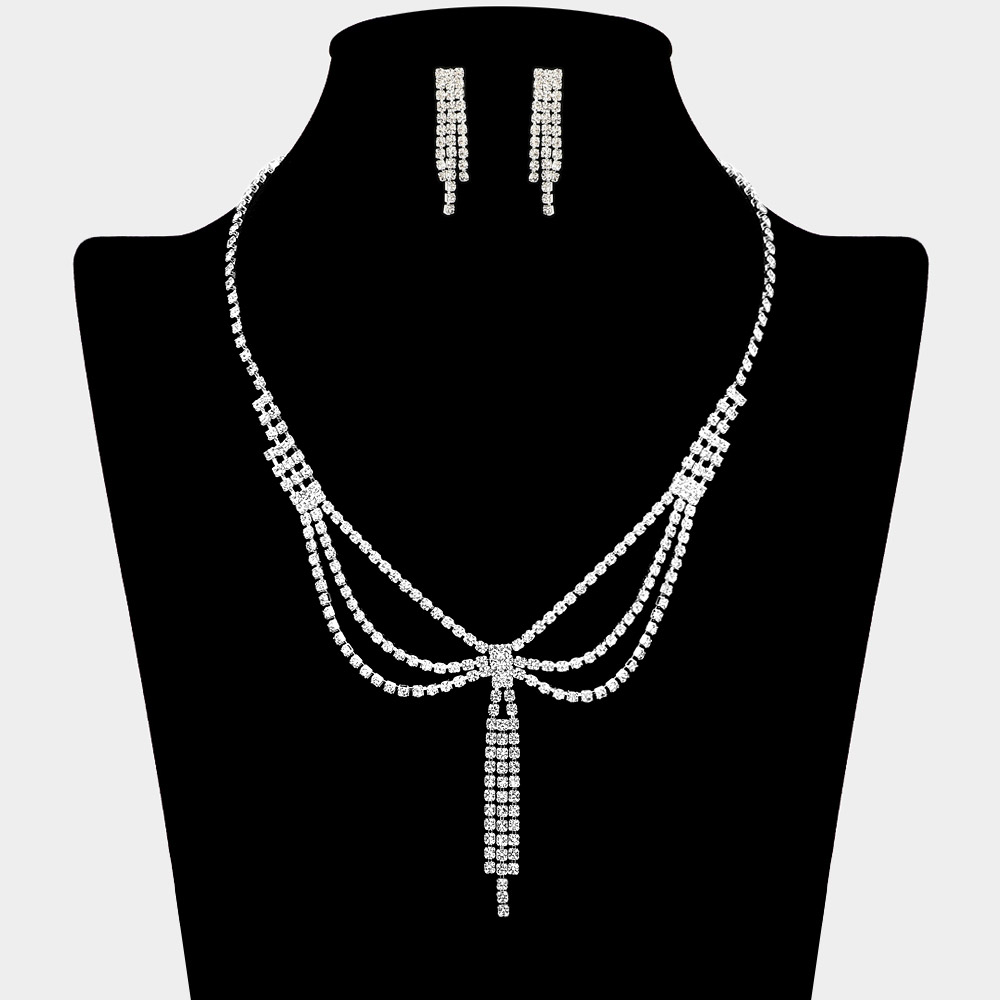 Details • Necklace Size : 16.5" + 4" L • Decor Size : 2.4" L • Earrings Size : 1.25" L • Elegant layered necklace and earring set featuring cascading rhinestone strands and a center tassel accent. The draped silhouette adds graceful movement, perfect for formal events, evening wear, or stylish special occasions. • Lead and Nickel Compliant